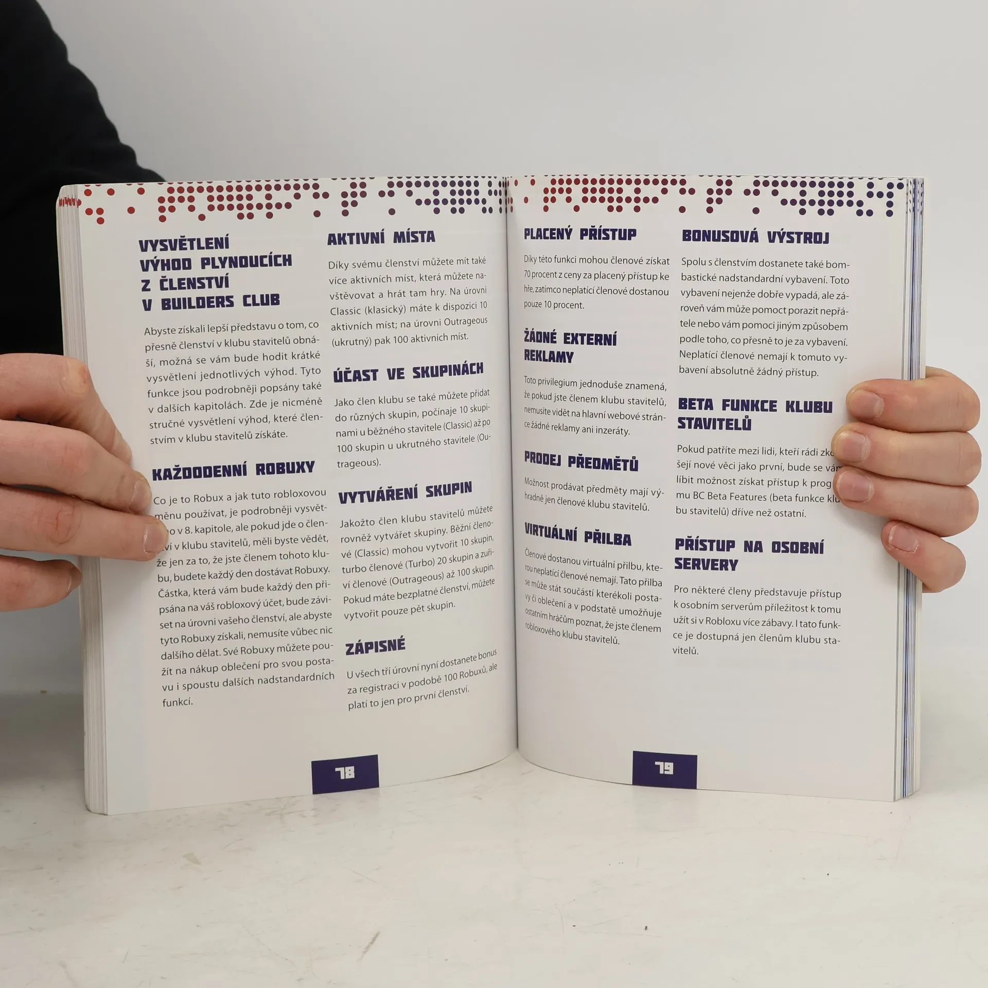 Všechno, co potřebujete vědět k hraní Robloxu a stavění vlastních her Chcete se naučit vytvářet vlastní 3D světy a hry a sdílet je s přáteli? Chcete si užít hraní Robloxu naplno? Pak je tato kniha právě pro vás! Provede vás oblíbenou sociální herní platformou od naprostých základů až po málo známé tipy a triky.Připojte se k milionům dalších hráčů a fanoušků a nezaspěte herní revoluci, kterou Roblox dozajista je.