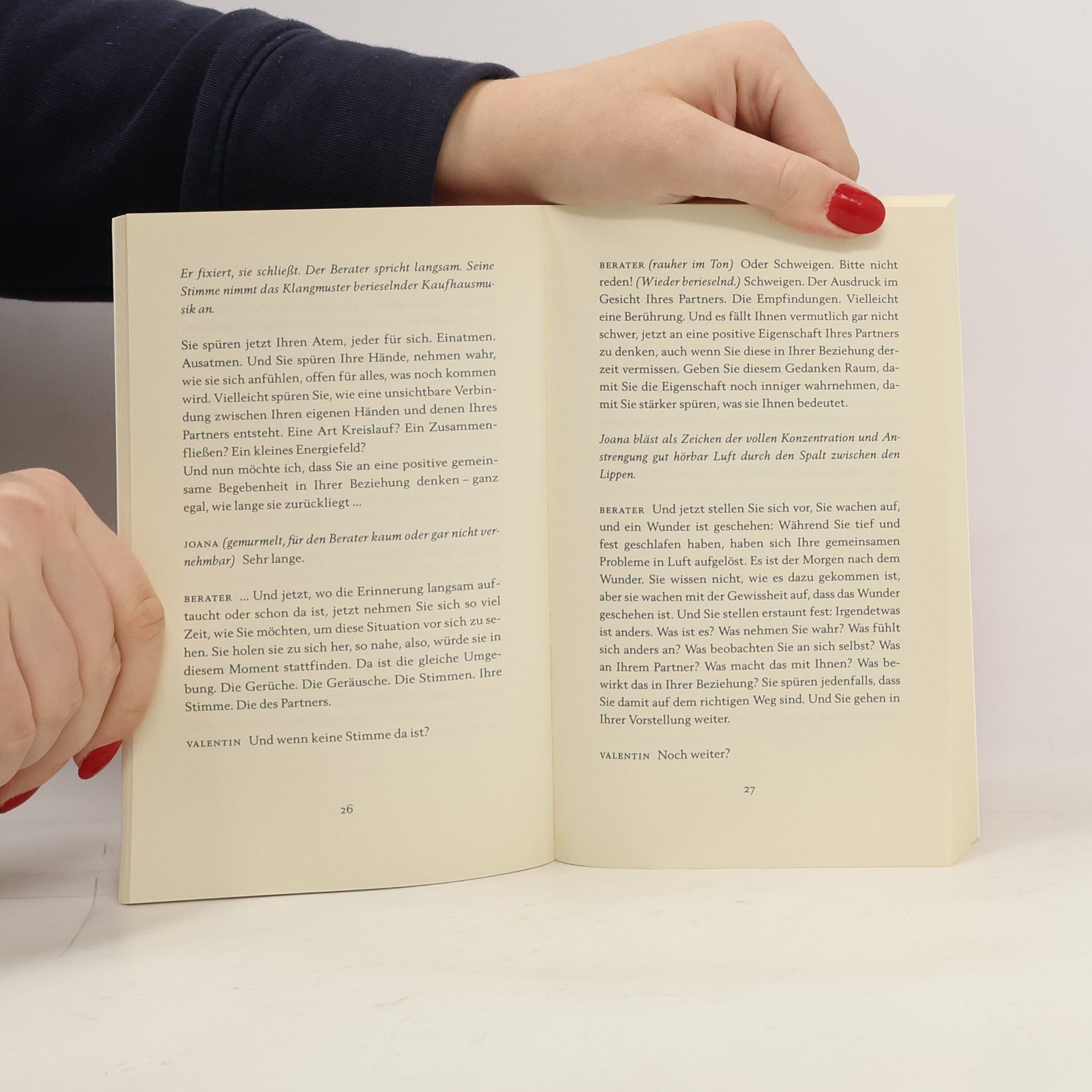 Eine Paartherapie und ihre Folgen – eine beschwingte Komödie voller Überraschungen und treffsicherer Pointen. Die Beziehung von Joana und Valentin ist am Tiefpunkt angelangt. Ein Paartherapeut soll helfen, doch der bekommt die beiden Streithähne einfach nicht in den Griff: Schließlich weiß Joana immer schon vorher, was ihr Ehemann sagen will – warum ihn also überhaupt zu Wort kommen lassen? Valentin straft Joana dafür mit Gefühlskälte, nimmt jeden Missstand als gegeben hin und sieht keinen Grund für Veränderung. Doch nicht nur das Paar hat Probleme – auch der Therapeut scheint in Schwierigkeiten zu stecken. Mitten in der Sitzung kommt es zum Eklat. Und plötzlich fangen alle an zu reden ...