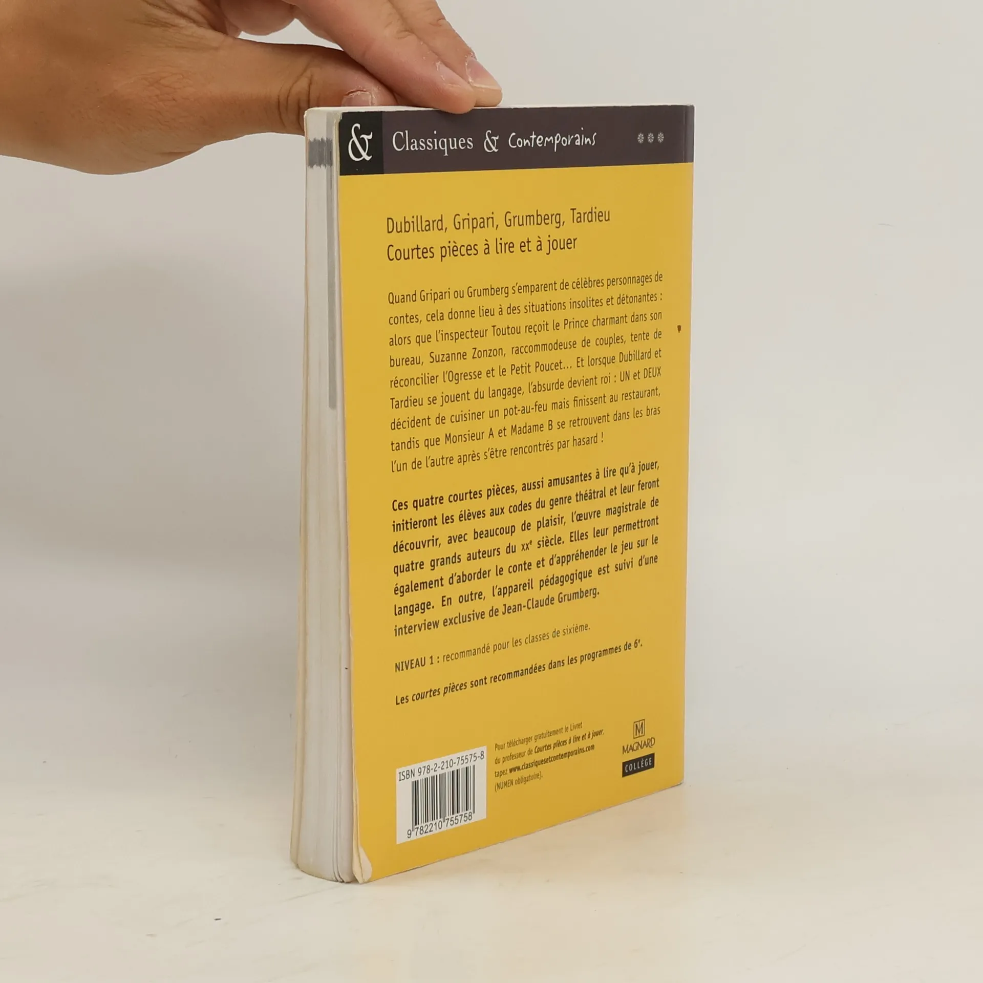 Quand Gripari ou Grumberg s'emparent de célèbres personnages de contes, cela donne lieu à des situations insolites et détonantes : alors que l'inspecteur Toutou reçoit le Prince charmant dans son bureau, Suzanne Zonzon, raccommodeuse de couples, tente de réconcilier l'Ogresse et le Petit Poucet... Et lorsque Dubillard et Tardieu se jouent du langage, l'absurde devient roi : Un et Deux décident de cuisiner un pot-au-feu mais finissent au restaurant, tandis que Monsieur A et Madame B se retrouvent dans les bras l'un de l'autre après s'être rencontrés par hasard ! Ces quatre courtes pièces, aussi amusantes à lire qu'à jouer, initieront les élèves aux codes du genre théâtral et leur feront découvrir, avec beaucoup de plaisir, l'oeuvre magistrale de quatre grands auteurs du XXe siècle. Elles leur permettront également d'aborder le conte et d'appréhender le jeu sur le tangage. En outre, l'appareil pédagogique est suivi d'une interview exclusive de Jean-Claude Grumberg.