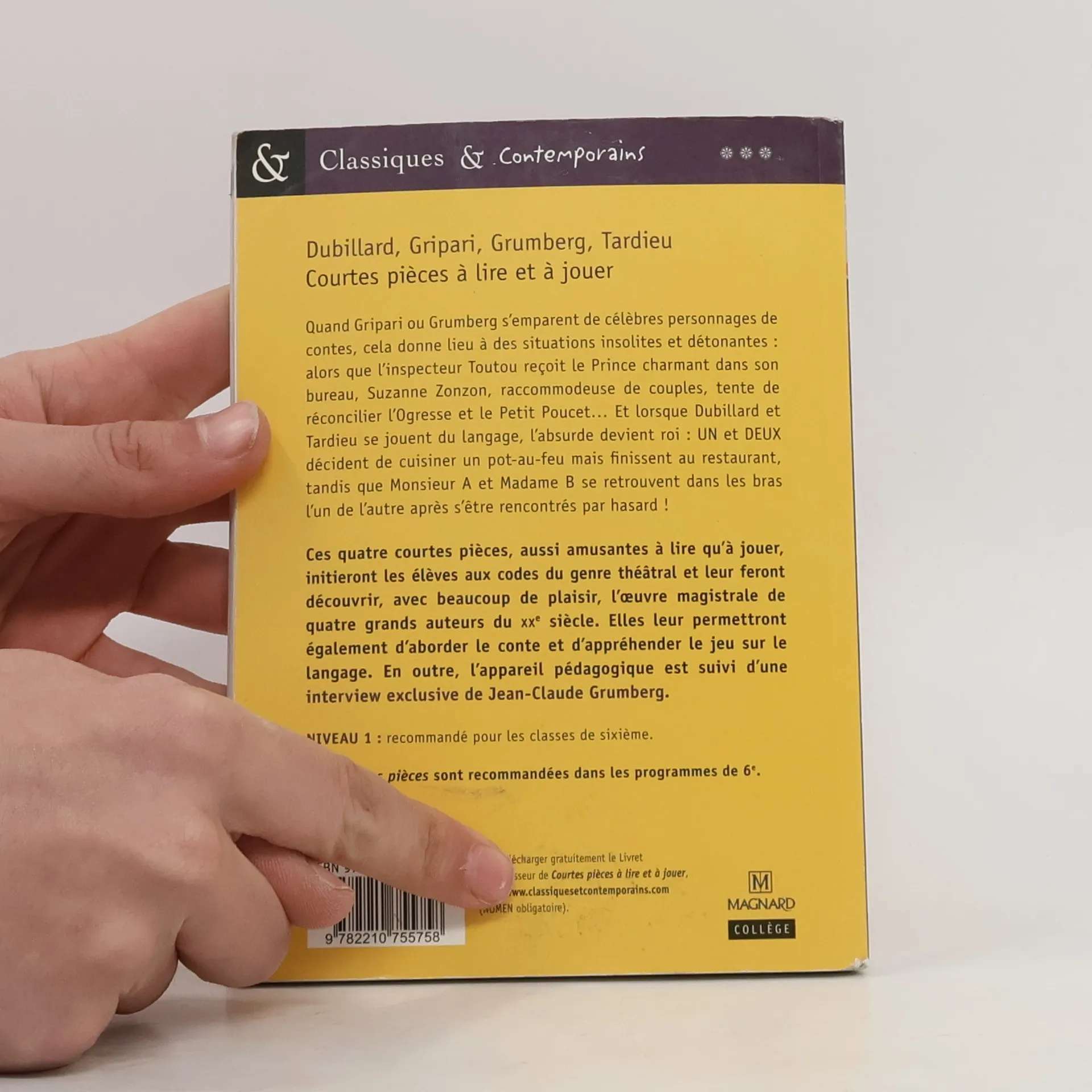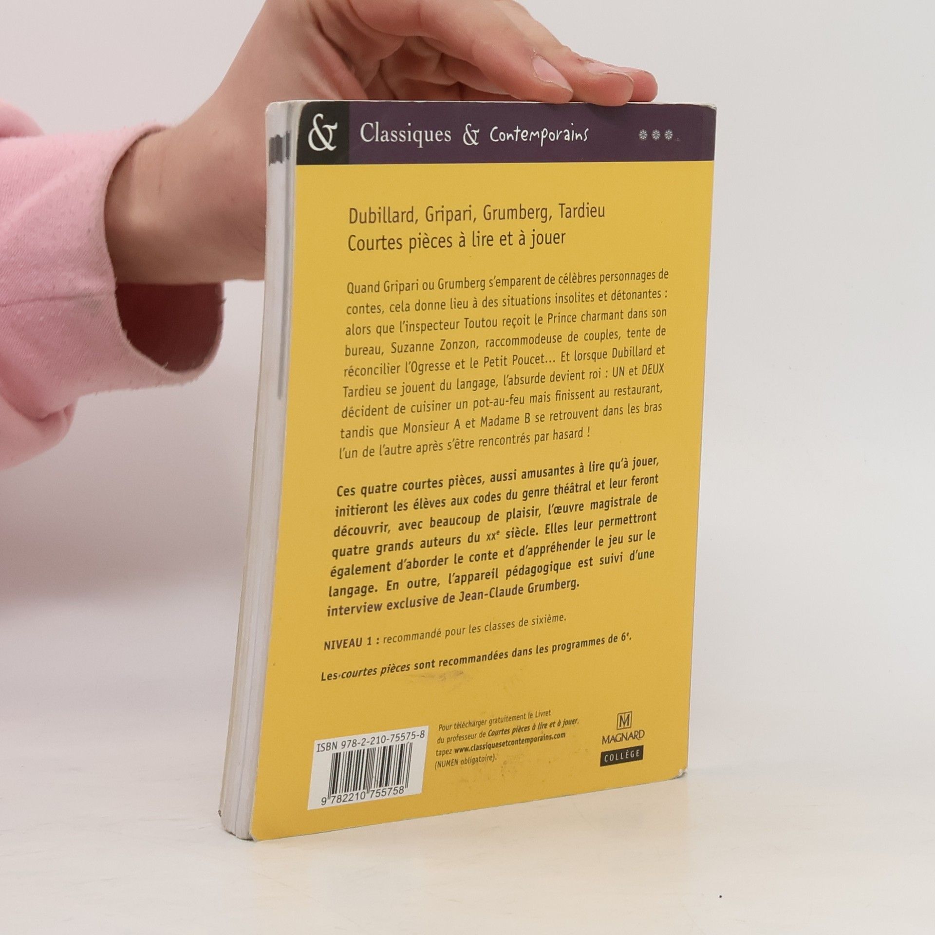 Quand Gripari ou Grumberg s'emparent de célèbres personnages de contes, cela donne lieu à des situations insolites et détonantes : alors que l'inspecteur Toutou reçoit le Prince charmant dans son bureau, Suzanne Zonzon, raccommodeuse de couples, tente de réconcilier l'Ogresse et le Petit Poucet... Et lorsque Dubillard et Tardieu se jouent du langage, l'absurde devient roi : Un et Deux décident de cuisiner un pot-au-feu mais finissent au restaurant, tandis que Monsieur A et Madame B se retrouvent dans les bras l'un de l'autre après s'être rencontrés par hasard ! Ces quatre courtes pièces, aussi amusantes à lire qu'à jouer, initieront les élèves aux codes du genre théâtral et leur feront découvrir, avec beaucoup de plaisir, l'oeuvre magistrale de quatre grands auteurs du XXe siècle. Elles leur permettront également d'aborder le conte et d'appréhender le jeu sur le tangage. En outre, l'appareil pédagogique est suivi d'une interview exclusive de Jean-Claude Grumberg.