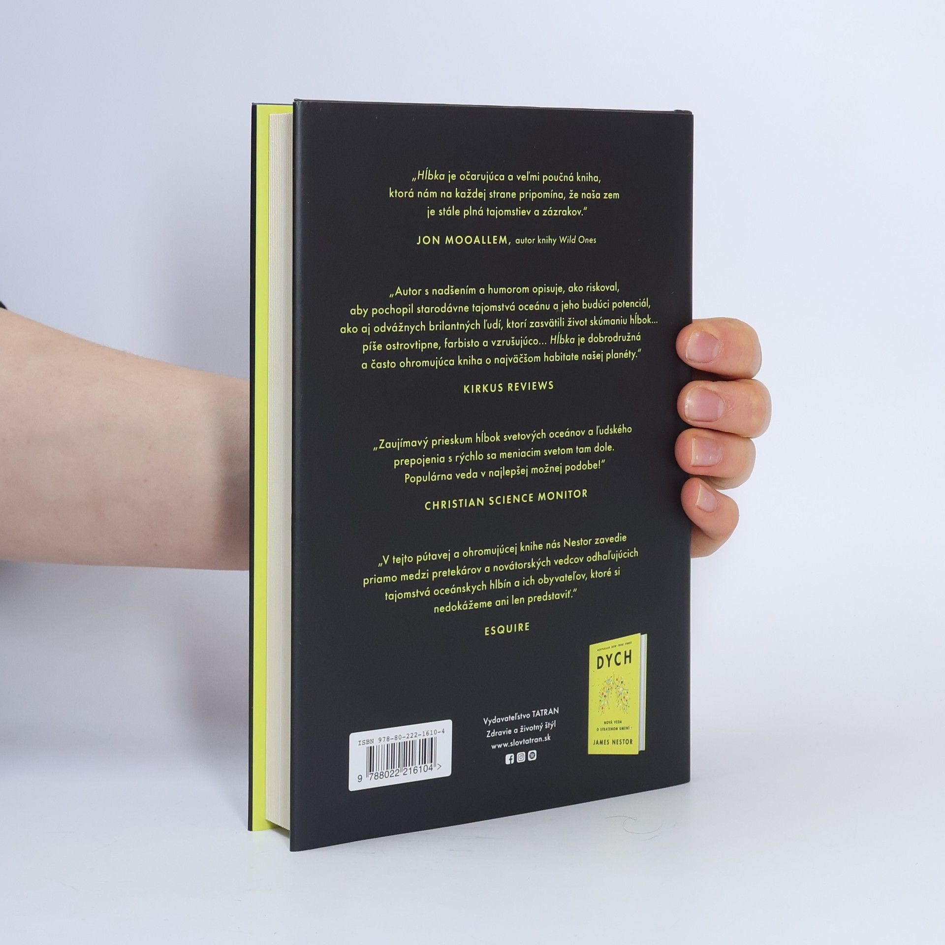 Keď bol novinár James Nestor na služobnej ceste v Grécku, bol svedkom niečoho, čo ho zmiatlo: muž sa na jeden nádych ponoril 300 metrov pod hladinu a po štyroch minútach sa vrátil späť, nezranený a usmiaty. Tento muž bol freediver a jeho obojživelné schopnosti inšpirovali Nestora, aby pátral po tajomstvách tejto málo známej disciplíny. Hĺbka je putovaním z hladiny oceánu do jeho najtemnejších hlbín, najzáhadnejších miest na planéte Zem. Nestor sa pridá k partii extrémnych športovcov a rebelských vedcov, ktorí menia nielen naše poznatky o planéte a jej tvoroch, ale aj naše chápanie ľudského tela a mysle. Zavedie nás do hĺbky 8,5 metra pod hladinu Atlantického oceánu a zoznámi nás s veľrybami, ktoré komunikujú s inými veľrybami vzdialenými stovky kilometrov, žralokmi, ktoré plávajú neomylne priamo cez čierno-čierne hlbiny vody, tulene, ktoré sa ponárajú až na osemdesiat minút do hĺbok pod 730 metrov, a ukáže nám aj iné zvláštne fenomény. Najpoučnejšie zo všetkého je, že tieto schopnosti sú odrazom pozoruhodného a často skrytého potenciálu nášho vlastného druhu – vrátane echolokácie, orientačného zmyslu a pod vodou navyše dochádza aj k iným významným telesným zmenám. Nestor cestou odomyká vlastné freedivingové zručnosti, keď sa dá dokopy s priekopníkmi, ktorí rozširujú definíciu toho, čo je možné v prírode a v nás samých.