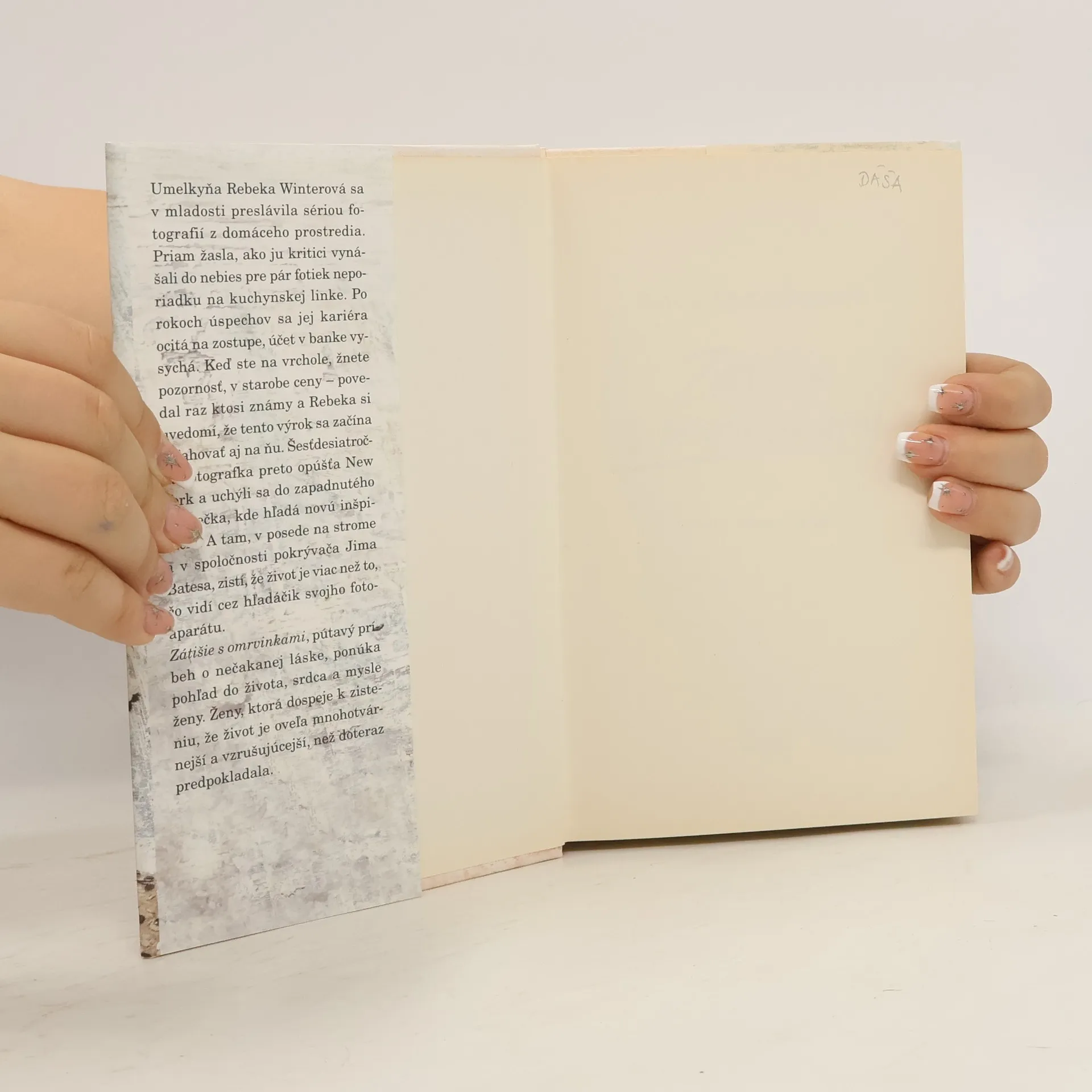 Umelkyňa Rebeka Winterová sa v mladosti preslávila sériou fotografií z domáceho prostredia. Priam žasla, ako ju kritici vynášali do nebies pre pár fotiek neporiadku na kuchynskej linke. Po rokoch úspechov sa jej kariéra ocitá na zostupe, účet v banke vysychá. Keď ste na vrchole, žnete pozornosť, v starobe ceny – povedal raz ktosi známy a Rebeka si uvedomí, že tento výrok sa začína vzťahovať aj na ňu. Šesťdesiatročná fotografka preto opúšťa New York a uchýli sa do zapadnutého mestečka, kde hľadá novú inšpiráciu. A tam, v posede na strome a v spoločnosti pokrývača Jima Batesa, zistí, že život je viac než to, čo vidí cez hľadáčik fotoaparátu. Zátišie s omrvinkami, pútavý príbeh o nečakanej láske, ponúka pohľad do života, srdca a mysle ženy. Ženy, ktorá dospeje k zisteniu, že život je oveľa mnohotvárnejší a vzrušujúcejší, než predpokladala. Z anglického originálu Still Life with Bread Crumbs (Hutchinson, London 2014) preložila Zdenka Buntová.
