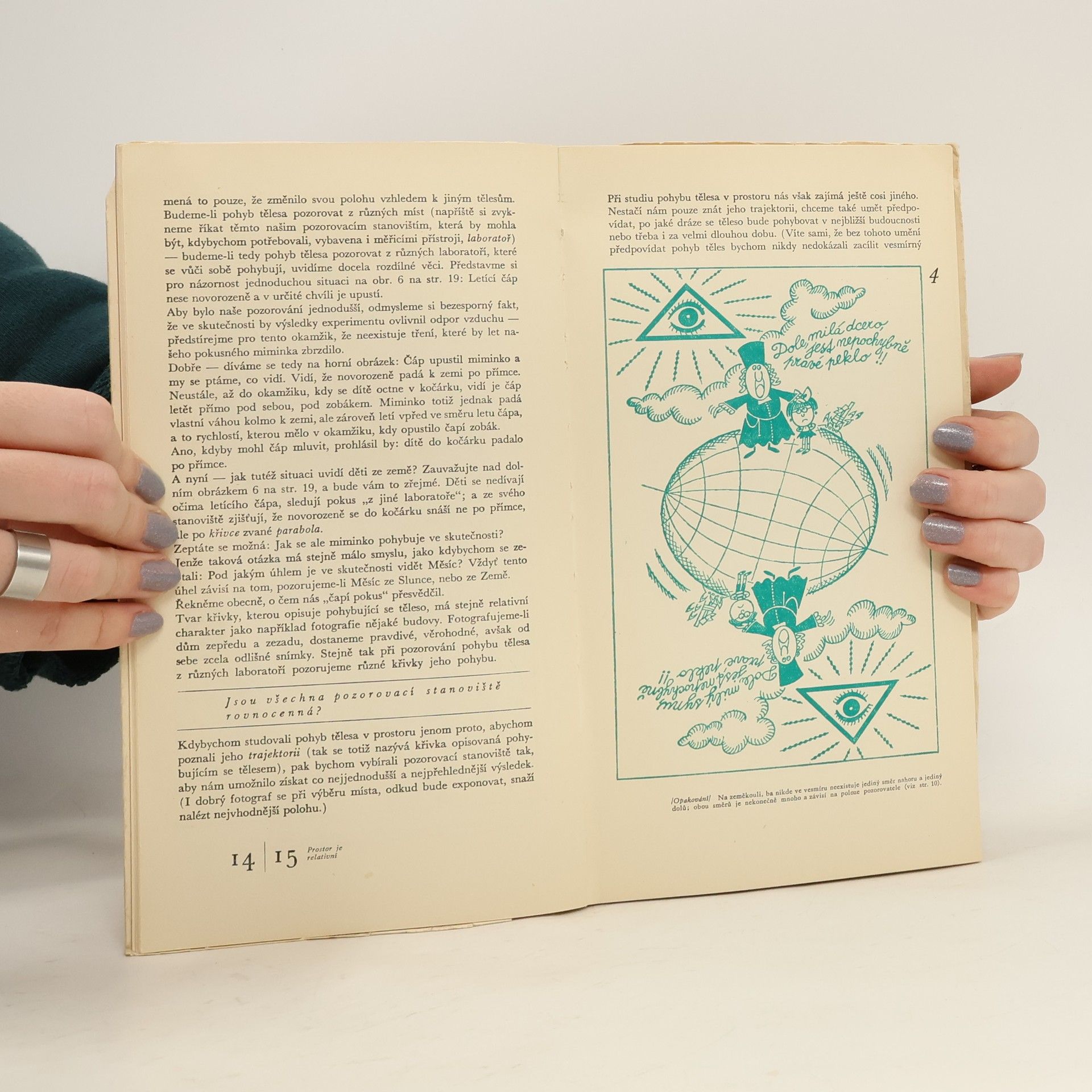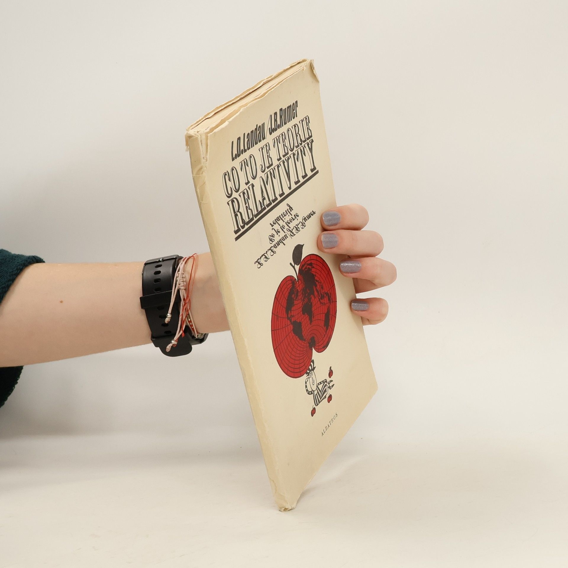 Velmi obtížné problémy, které vznikají, hledíme-li na jevy ze zorného úhlu teorie relativity, jsou vysvětlovány vtipnou a co nejsrozumitelnější formou za přispění humorných ilustrací. Odborná úroveň je zajištěna tím, že jeden z autorů, Landau, je předním sovětským fyzikem. Na závěrbylo převyprávěno několik stran vzpomínek polského vědce L. Infelda na A. Einsteina. - Knížka obalena modrou stužkou s nápisem "V krátké době vychází již třetí vydání knížky slavného fyzika L. D. Landaua Co to je teorie relativity". - Volně přeložil a upravil Petr Glogar.