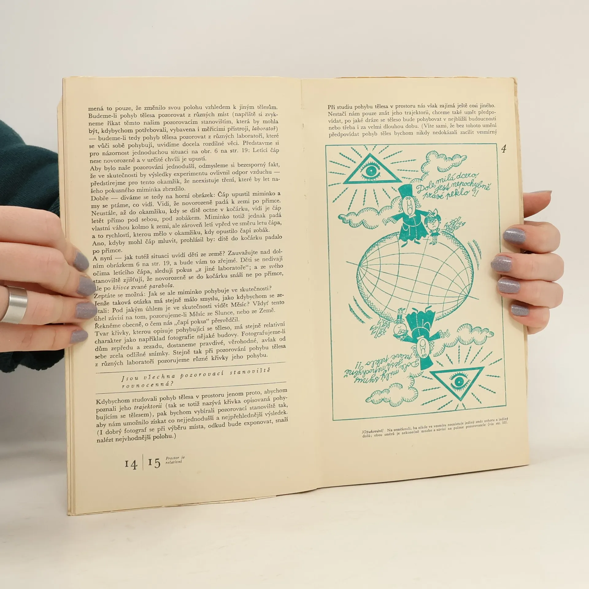 Velmi obtížné problémy, které vznikají, hledíme-li na jevy ze zorného úhlu teorie relativity, jsou vysvětlovány vtipnou a co nejsrozumitelnější formou za přispění humorných ilustrací. Odborná úroveň je zajištěna tím, že jeden z autorů, Landau, je předním sovětským fyzikem. Na závěrbylo převyprávěno několik stran vzpomínek polského vědce L. Infelda na A. Einsteina. - Knížka obalena modrou stužkou s nápisem "V krátké době vychází již třetí vydání knížky slavného fyzika L. D. Landaua Co to je teorie relativity". - Volně přeložil a upravil Petr Glogar.