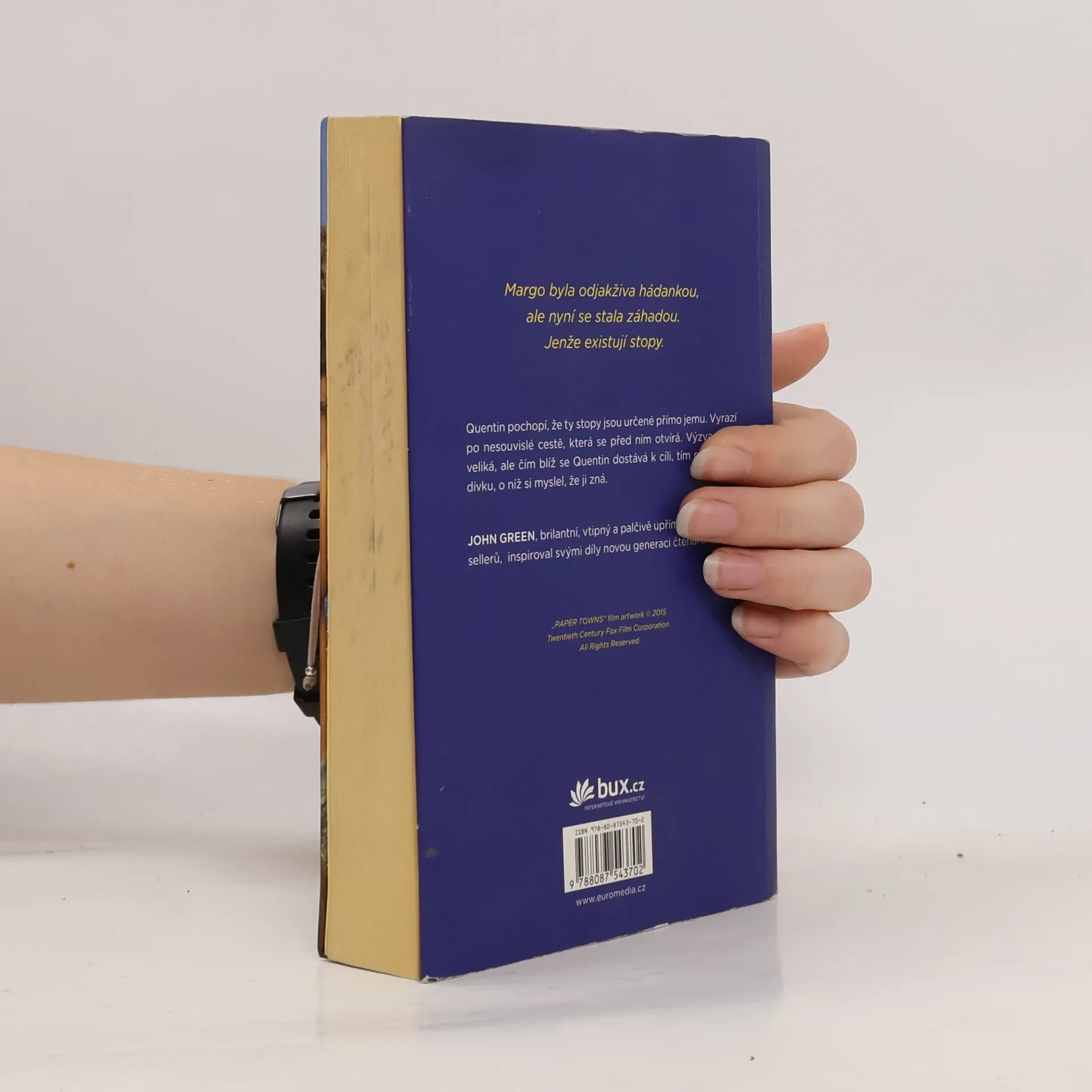 Po úspěchu románů Hvězdy nám nepřály a Hledání Aljašky vychází nyní v českém překladu další dílo veleúspěšného autora Johna Greena, který si i u nás bleskurychle získal početný fanklub. Hrdinou je Quentin Jacobsen, normální, tak trochu bojácný kluk, který má od dětství rád nespoutanou Margo. Ta mu pak jednoho dne nečekaně zaklepe na okno a vtáhne ho do podivuhodného dobrodružství. Když dívka další dny ve škole chybí, Quentin začne pátrat a brzy si uvědomí, že pro něj zanechala určité stopy. Znal vlastně Margo? A co jsou papírová města, s nimiž se nyní stále setkává? Oblíbený autor přináší brilantní příběh nabitý upřímnými emocemi, který nenechá čtenáře chladným.