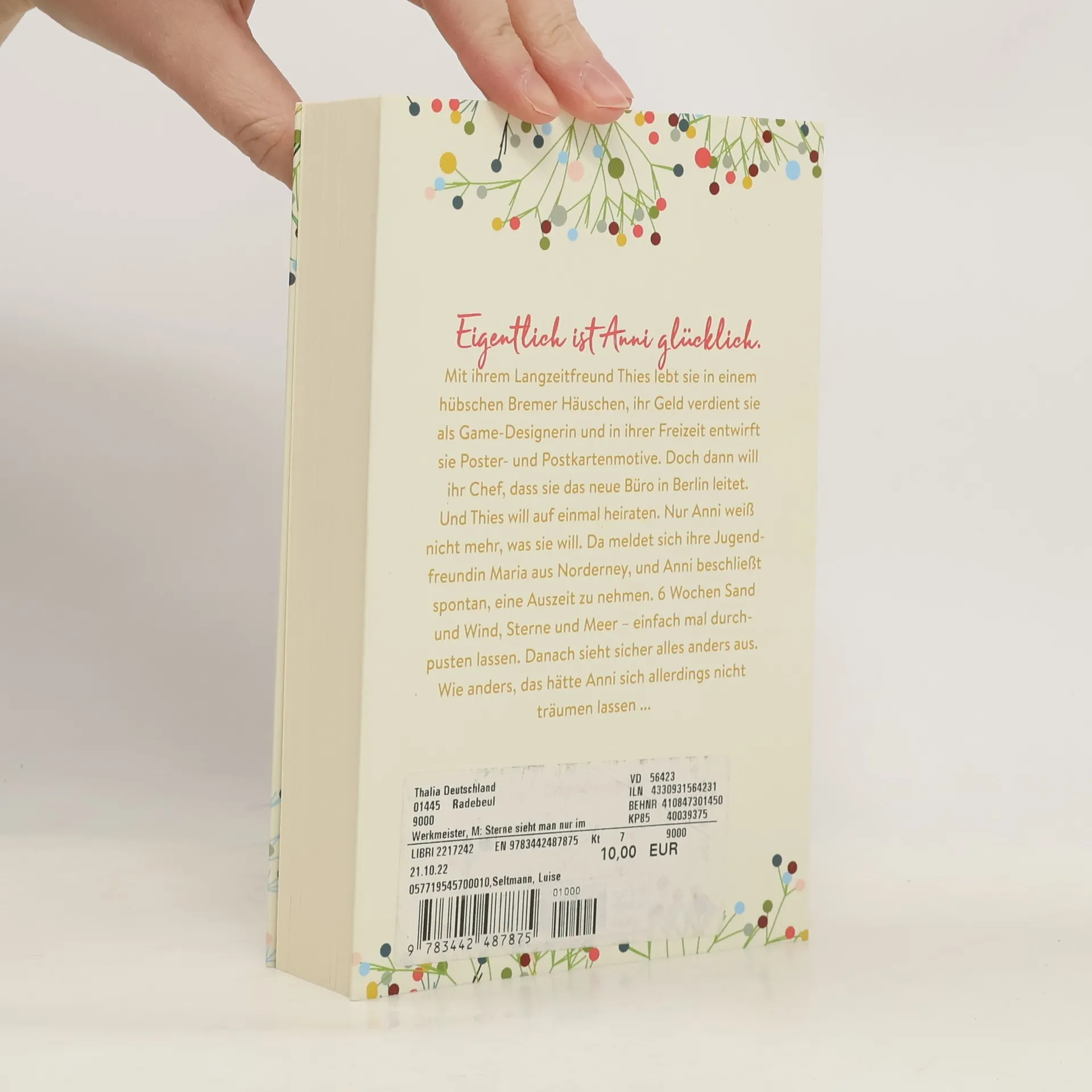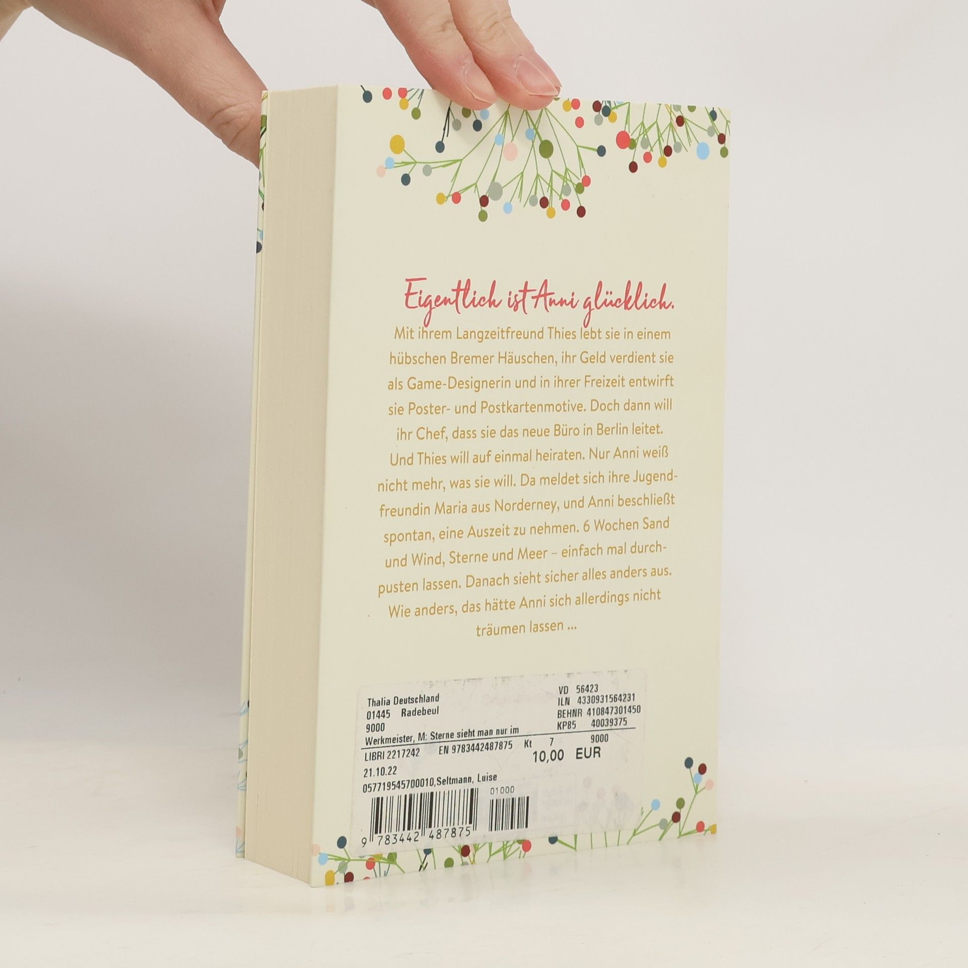 Eigentlich ist Anni glücklich. Mit ihrem Langzeitfreund Thies lebt sie in einem hübschen Bremer Häuschen, ihr Geld verdient sie als Game-Designerin und in ihrer Freizeit entwirft sie Poster- und Postkartenmotive. Doch dann will ihr Chef, dass sie das neue Büro in Berlin leitet. Und Thies will auf einmal heiraten. Nur Anni weiß nicht mehr, was sie will. Da meldet sich ihre Jugendfreundin Maria aus Norderney, und Anni beschließt spontan, eine Auszeit zu nehmen. 6 Wochen Sand und Wind, Sterne und Meer – einfach mal durchpusten lassen. Danach sieht sicher alles anders aus. Wie anders, das hätte Anni sich allerdings nicht träumen lassen ...