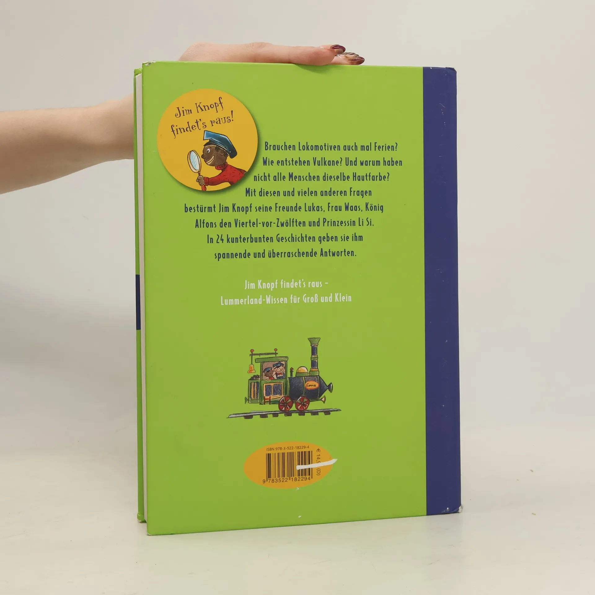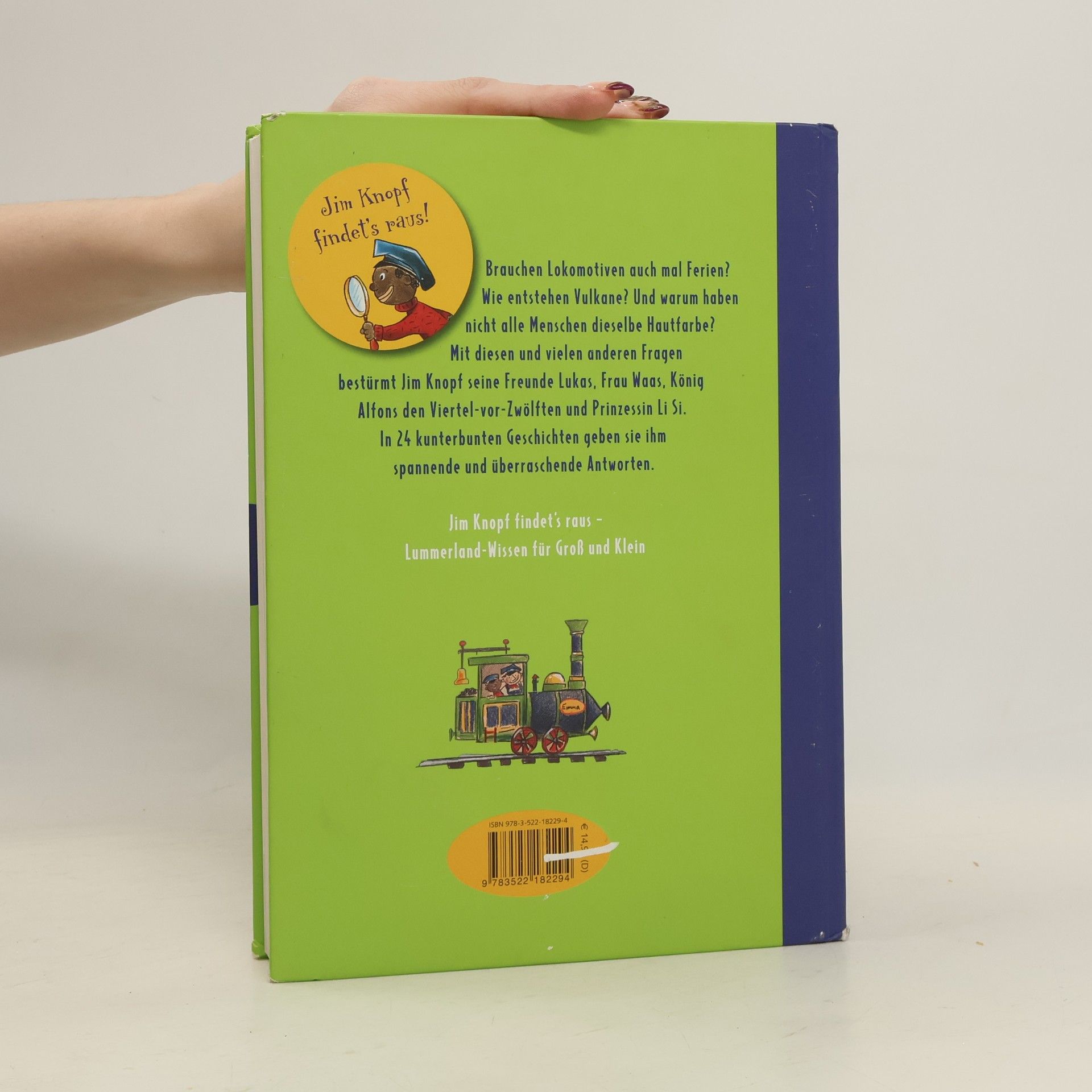 Eine Frage-Antwort-Buch rund um Jim Knopf und seine Freunde für Kinder ab 5 Jahren, von Bestseller-Autor Michael Ende. Brauchen Lokomotiven auch mal Ferien? Wie entstehen Vulkane? Und warum haben nicht alle Menschen dieselbe Hautfarbe? Viele wichtige Fragen mit denen sich Jim Knopf beschäftigt und Antworten bei seinen Freunden Lukas der Lokomotivführer, Frau Waas, König Alfons den Viertel-vor-Zwölften und Prinzessin Li Si sucht. In 24 kunterbunten Geschichten über Vulkane, Lokomotiven und Scheinriesen, geben sie ihm spannende und überraschende Antworten.