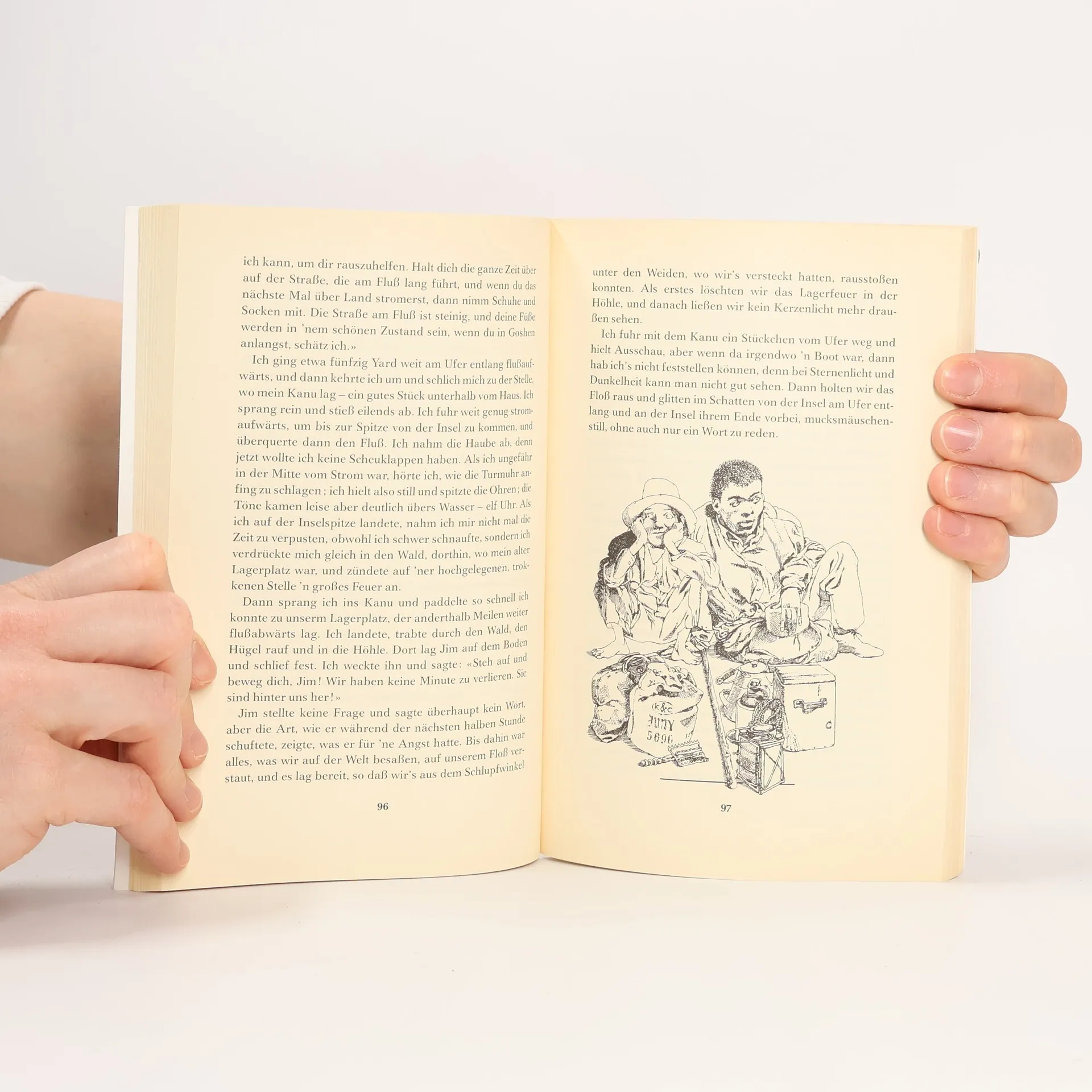 Huckleberry Finn reiss von zu Hause aus und treibt mit dem geflohenen Negersklaven Jim auf einem Floss den Mississippi hinab