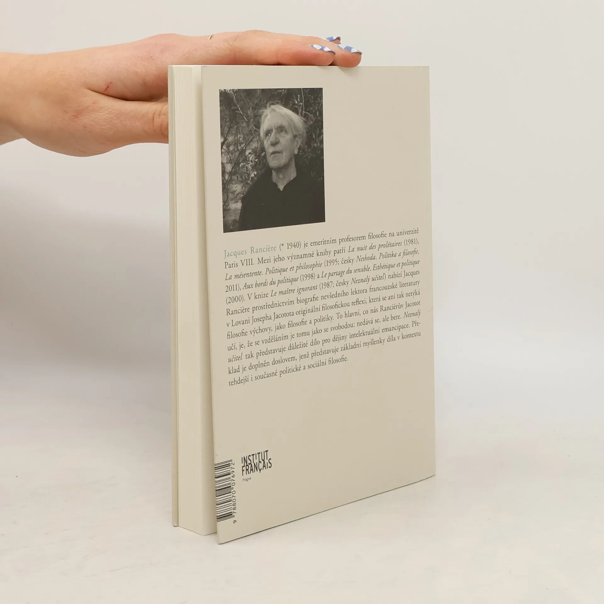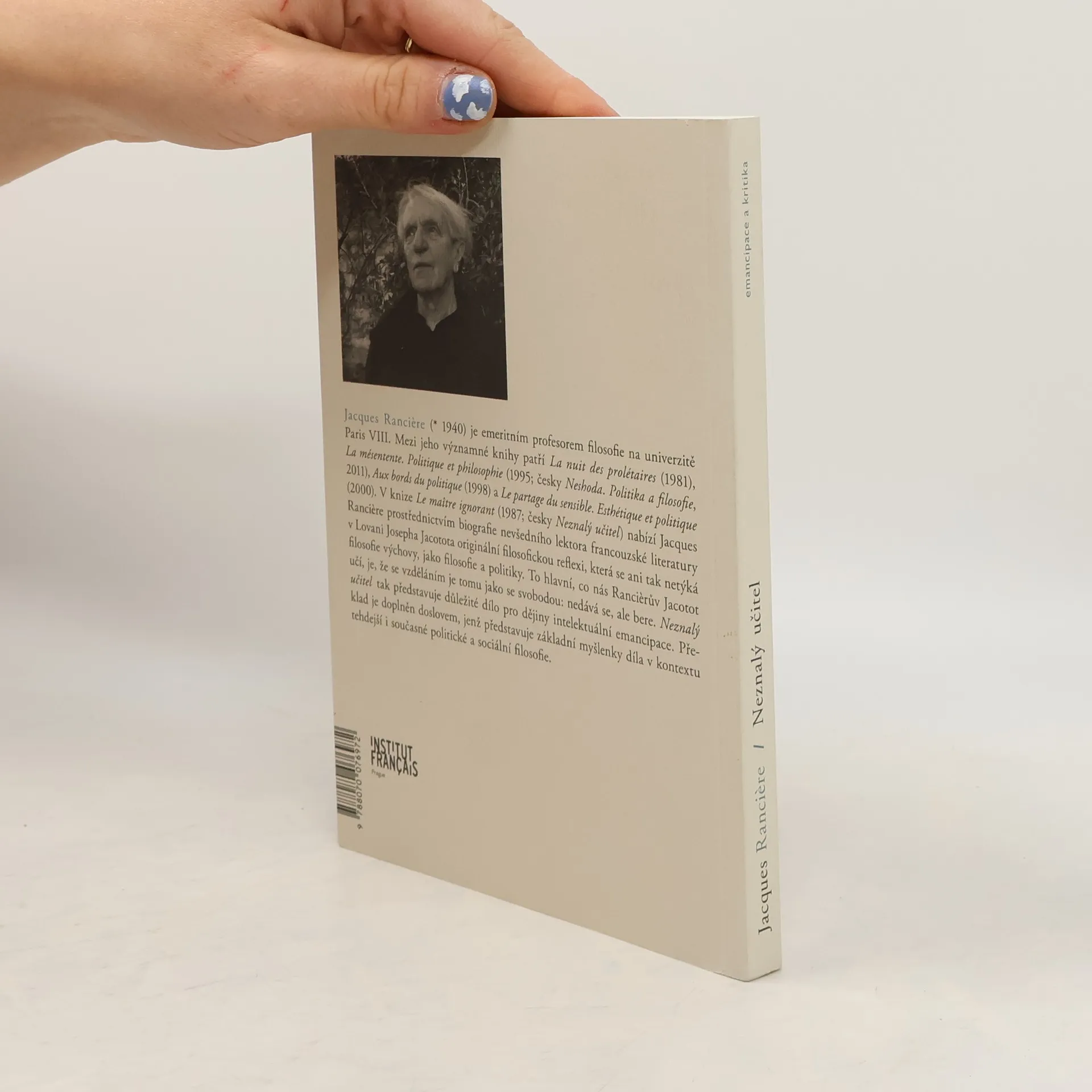 V knize Le maître ignorant (1987) nabízí Jacques Rancière, prostřednictvím biografie nevšedního lektora francouzské literatury v Lovani Josepha Jacotota, originální filosofickou reflexi, která se ani tak netýká filosofie výchovy, jako filosofie a politiky. To hlavní, co nás Rancièrův Jacotot učí, je, že se vzděláním je tomu jako se svobodou: nedává se, ale bere. Le maître ignorant představuje důležité dílo pro dějiny intelektuální emancipace. Kniha bude doplněna o úvodní studii, jež představí základní myšlenky díla v kontextu tehdejší i současné politické a sociální filosofie.