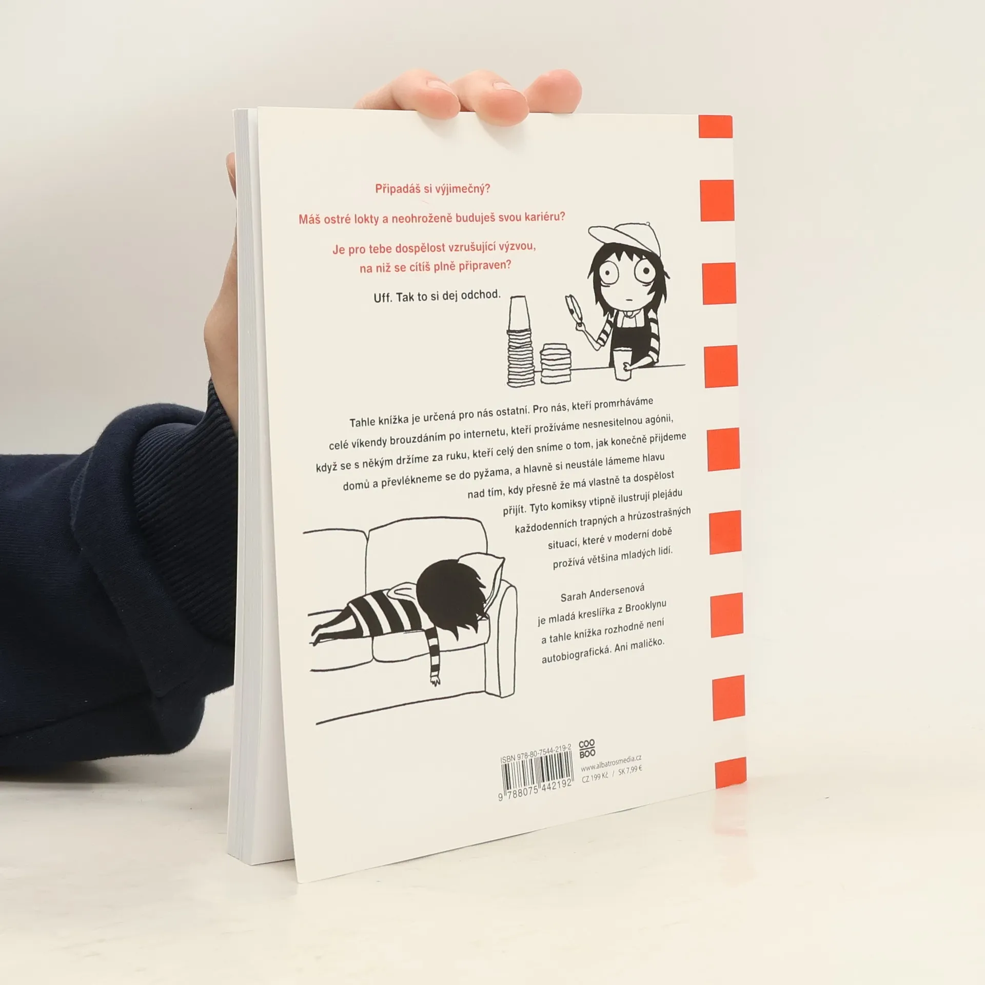 Tenhle komiks je pro všechny, kdo dokážou proflákat celé víkendy na internetu, pro které je držení se za ruce na ulici s naprosto úchvatným klukem nesnesitelná agónie, pro všechny, kdo sní o tom, že celý den zůstanou doma a budou se válet v pyžamu. A pro všechny, kdo přemýšlejí, kdy přesně vlastně ta dospělost začíná. Jinými slovy pro nás, kteří prožíváme hrůzy a trapnosti dnešního mladého života. Připadáš si výjimečný? Máš ostré lokty a neohroženě buduješ svou kariéru? Je pro tebe dospělost vzrušující výzvou, na niž se cítíš plně připravený? Uff. Tak to si dej odchod. Tahle knížka je určená pro nás ostatní, Pro nás, kteří promrháváme celé víkendy brouzdáním po internetu, kteří prožíváme nesnesitelnou agónii, když se s někým držíme za ruku, kteří celý den sníme o tom, jak konečně přijdeme domů a převlékneme se do pyžama, a hlavně si neustále lámeme hlavu nad tím, kdy přesně že má vlastně dospělost přijít. Tyto komiksy vtipně ilustrují plejádu každodenních trapných a hrůzostrašných situací, které v moderní době prožívá většina mladých lidí. Sarah Andersenová je mladá kreslířka z Brooklynu a tahle knížka rozhodně není autobiografická. Ani maličko.