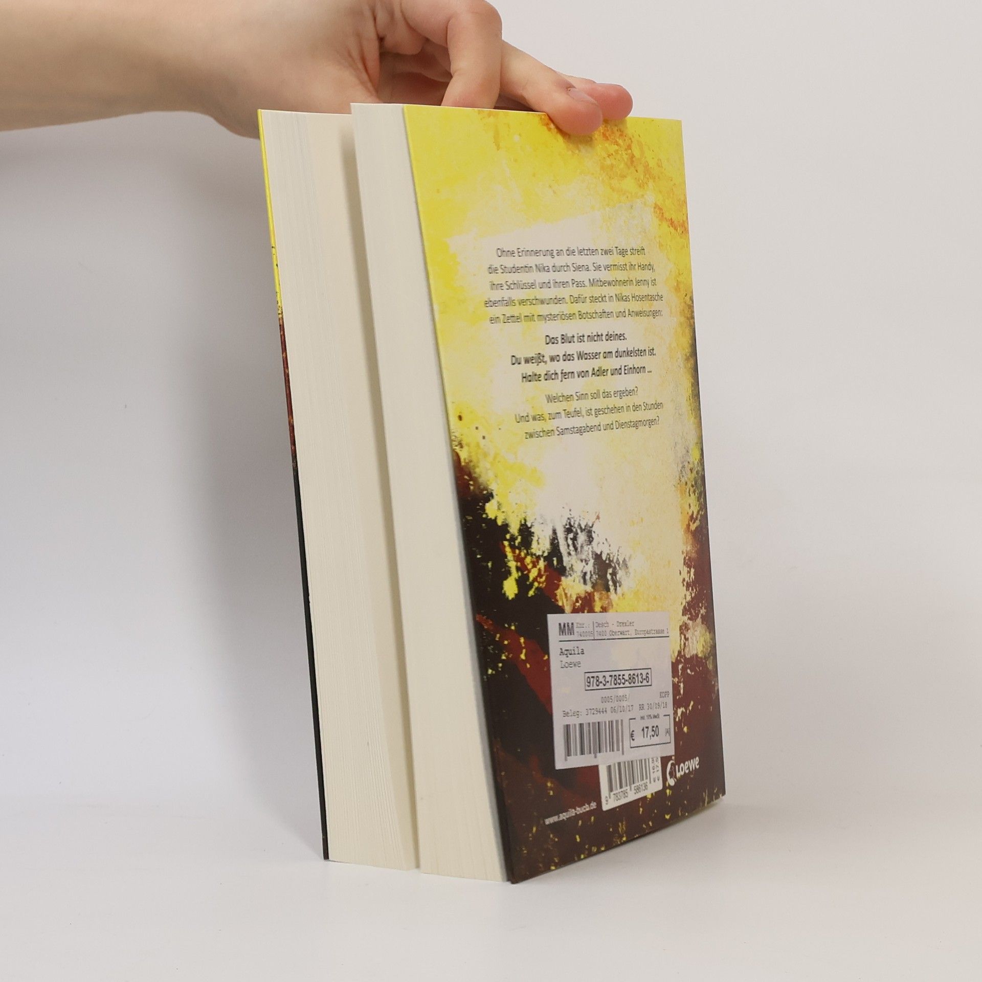 Das Buch ist bei deiner Buchhandlung vor Ort und bei vielen Online-Buchshops erhältlich! +++ Der Spiegel Nr. 1 Bestseller +++ Ohne Erinnerung an die letzten zwei Tage streift die Studentin Nika durch Siena. Sie vermisst ihr Handy, ihre Schlüssel und ihren Pass. Mitbewohnerin Jennifer ist ebenfalls verschwunden. Dafür steckt in Nikas Hosentasche ein Zettel mit mysteriösen Botschaften und Anweisungen. Das Blut ist nicht deines. Du weißt, wo das Wasser am dunkelsten ist. Halte dich fern von Adler und Einhorn ... Welchen Sinn soll das ergeben? Und was, zum Teufel, ist geschehen zwischen Samstagabend und Dienstagmorgen? Bestseller-Autorin Ursula Poznanski schickt ihre Heldin durch die engen Gassen und die unterirdischen Labyrinthe Sienas, die ebenso im Dunkel liegen wie Nikas Erinnerungen an die letzten zwei Tage. Ein unlösbar scheinendes Rätsel, ein monströser Verrat und die geheimnisvollen Symbole des mittelalterlichen Siena bilden das Gerüst dieses exzellenten Psychothrillers. Mehr Infos und Hintergründe zum Buch unter: www. aquila-buch. de