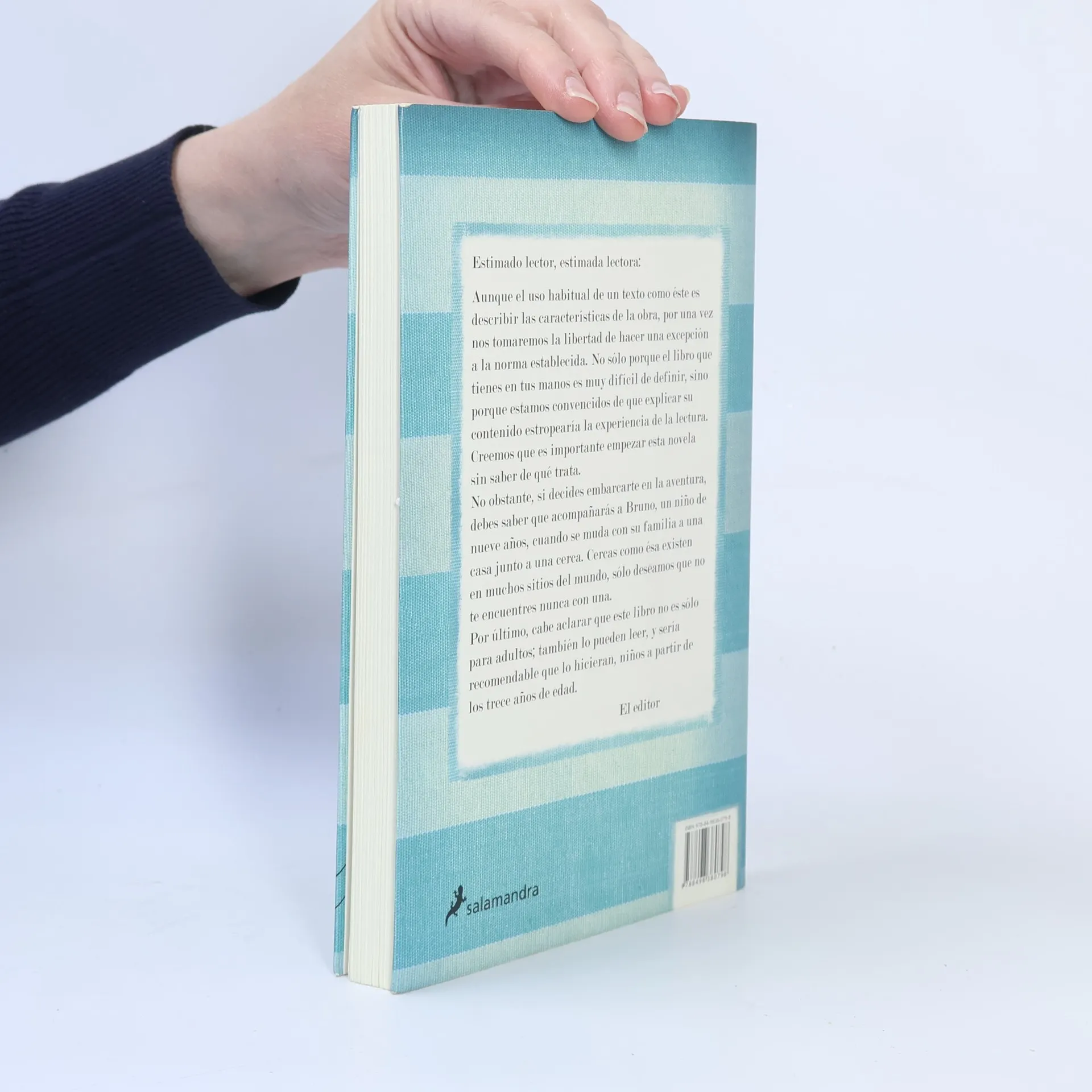 Estimado lector, estimada lectora:Aunque el uso habitual de un texto como éste es describir las características de la obra, por una vez nos tomaremos la libertad de hacer una excepción a la norma establecida. No sólo porque el libro que tienes en tus manos es muy difícil de definir, sino porque estamos convencidos de que ex plicar su contenido estropearía la experiencia de la lectura. Creemos que es importante empezar esta novela sin saber de qué trata.No obstante, si decides embarcarte en la aventura, debes saber que acompañarás a Bruno, un niño de nueve años, cuando se muda con su familia a una casa junto a una cerca. Cercas como ésa existen en muchos sitios del mundo, sólo deseamos que no te encuentres nunca con una. Por último, cabe aclarar que este libro no es sólo para adultos; también lo pueden leer, y sería recomendable que lo hicieran, niños a partir de los trece años de edad