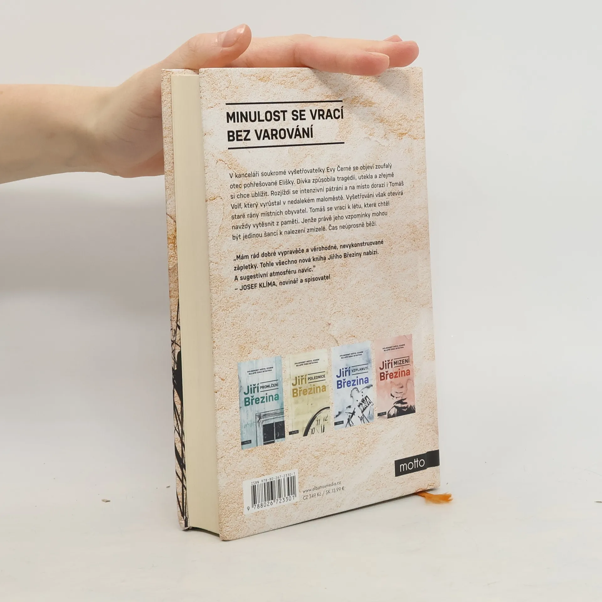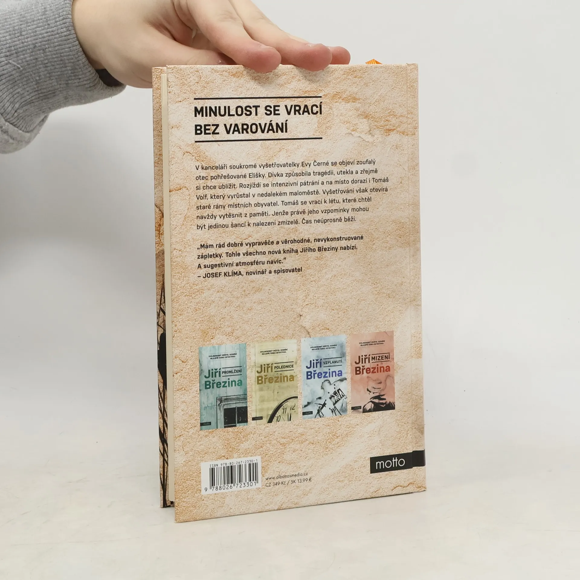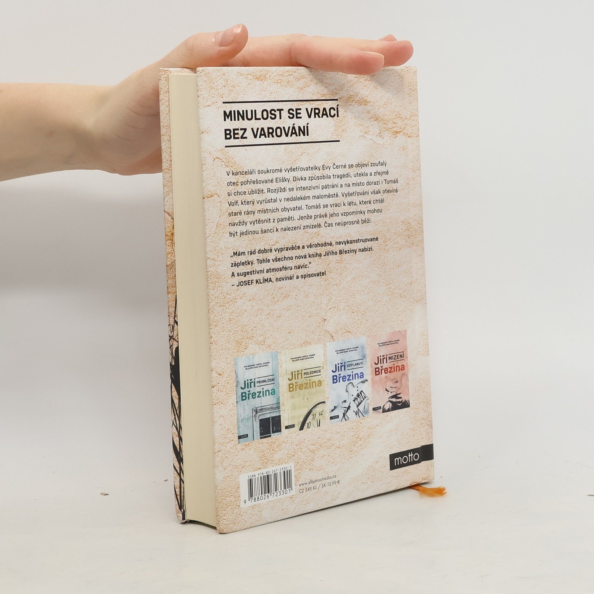Minulost se vrací bez varování. Pátý případ Tomáše Volfa. V kanceláři soukromé vyšetřovatelky Evy Černé se objeví zoufalý otec pohřešované Elišky. Dívka způsobila tragédii, utekla a zřejmě si chce ublížit. Rozjíždí se intenzivní pátrání a na místo dorazí i Tomáš Volf, který vyrůstal v nedalekém maloměstě. Vyšetřování však otevírá staré rány místních obyvatel. Tomáš se vrací k létu, které chtěl navždy vytěsnit z paměti. Jenže právě jeho vzpomínky mohou být jedinou šancí k nalezení zmizelé. Čas neúprosně běží.Dvojnásobný držitel ceny za nejlepší českou detektivku Jiří Březina se v pátém případu Tomáše Volfa vydává do minulosti, která souvisí se současným případem nejen místem činu. Autor odhaluje dospívání hlavního hrdiny, které ovlivnilo jeho pohled na svět a přimělo ho k zásadnímu rozhodnutí.Tomáš Volf se opět setkává s Evou Černou, kterou přivede pátrání po pohřešované Elišce do jeho rodiště. Dívka způsobila tragédii, utekla a vše nasvědčuje tomu, že si chce ublížit. Vyšetřování však otevírá staré rány místních obyvatel. Tomáš se vrací k létu, které chtěl navždy vytěsnit z paměti. Jenže právě jeho vzpomínky mohou být jedinou šancí k nalezení zmizelé. Čas neúprosně běží a současnost až nepříjemně připomíná patnáct let staré události.