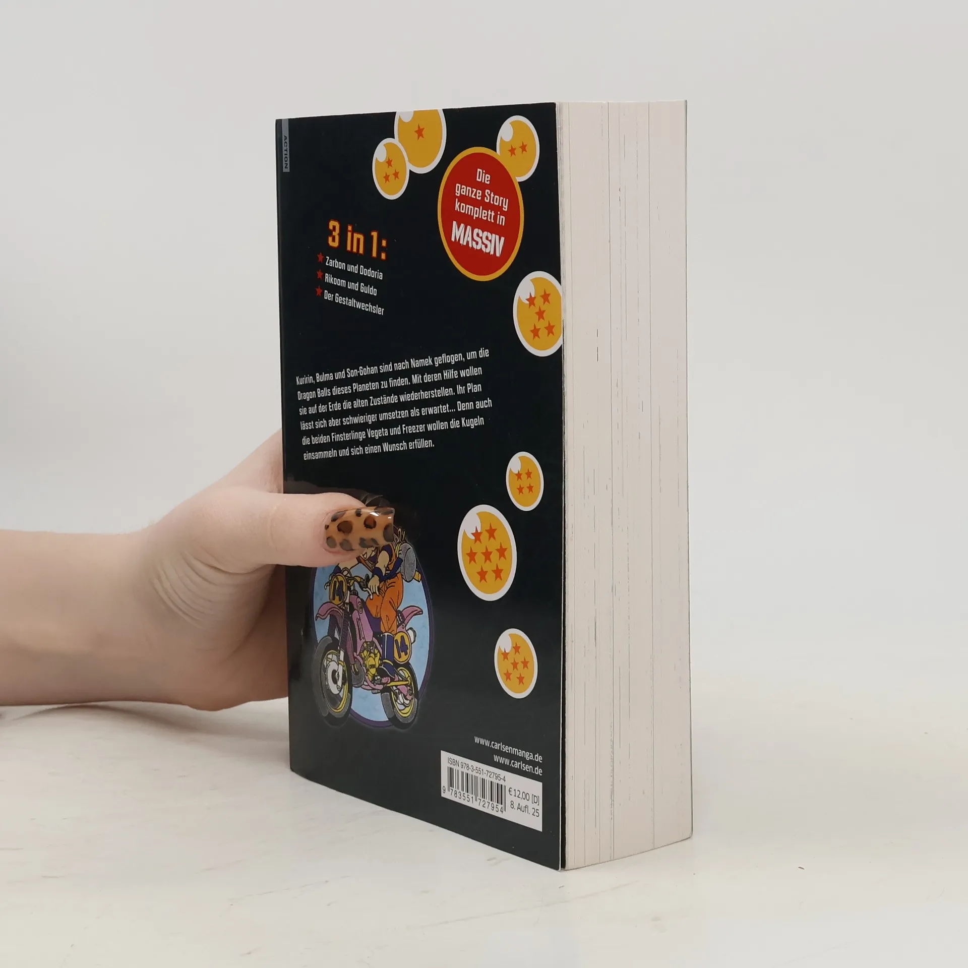 DRAGON BALL MASSIV ist die 3-in-1-Ausgabe des berühmten Mangas, die drei Taschenbuchausgaben in einem Band vereint. Die Geschichte folgt Kuririn, Bulma und Son-Gohan auf ihrer Suche nach den Dragon Balls auf Namek, während sie sich gegen die finsteren Vegeta und Freezer behaupten müssen. Ideal für Fans von Naruto und Co.