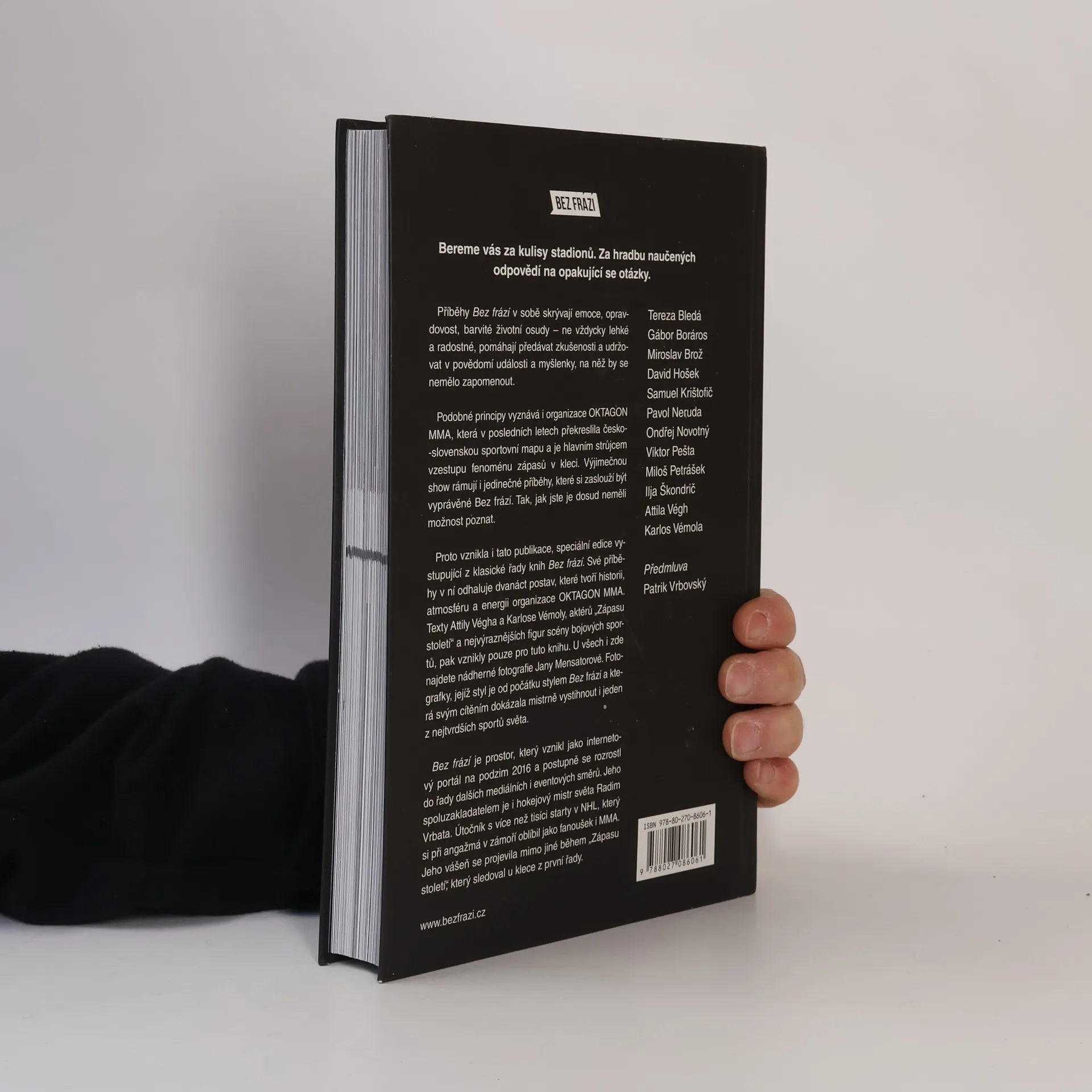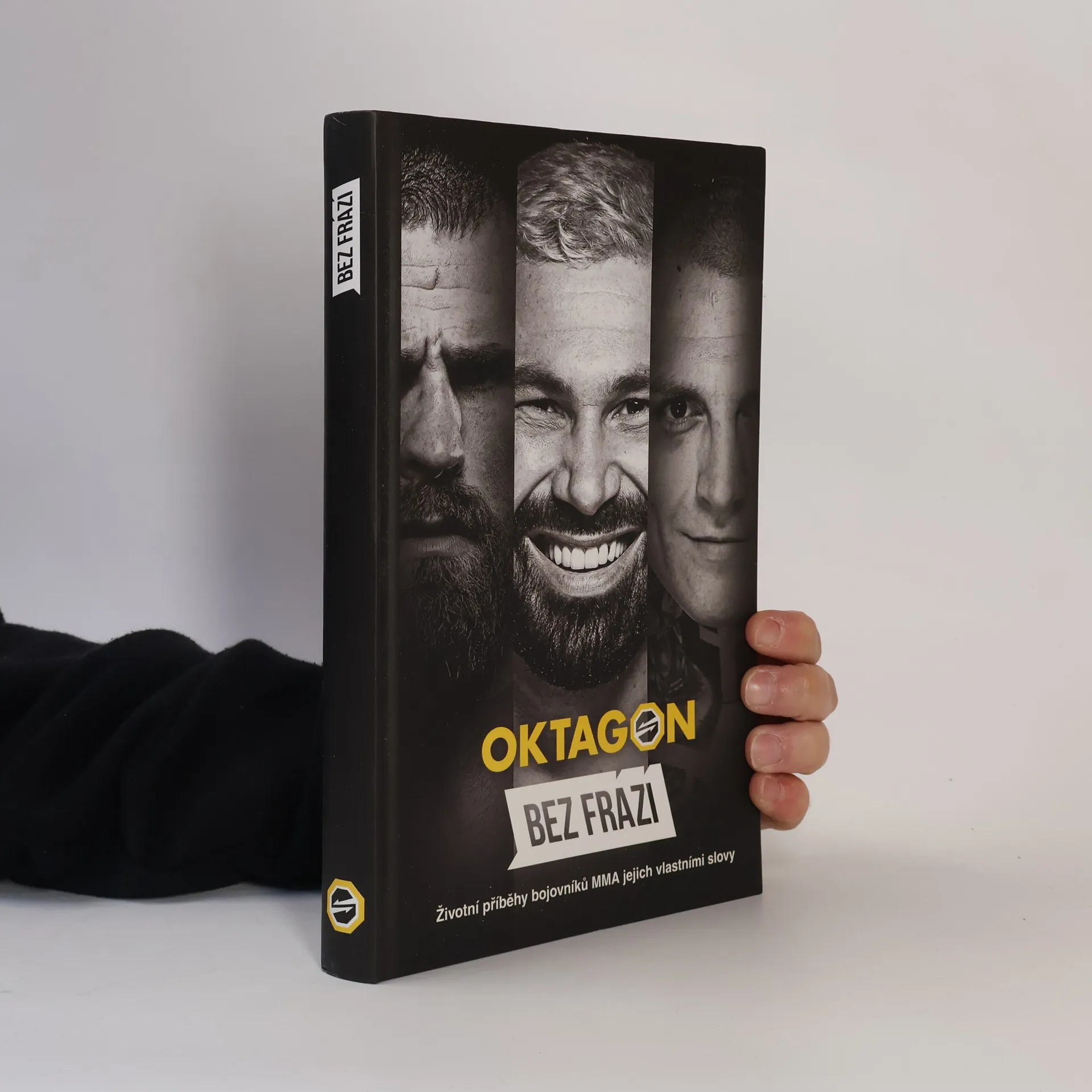 Příběhy Bez frází v sobě skrývají emoce, opravdovost, barvité životní osudy – ne vždycky lehké a radostné, pomáhají předávat zkušenosti a udržovat v povědomí události a myšlenky, na než by se nemělo zapomenout. Podobné principy vyznává i organizace OKTAGON MMA, která v posledních letech překreslila česko-slovenskou sportovní mapu a je hlavním strůjcem fenoménu zápasů v kleci u nás. Výjimečnou show rámují i jedinečné příběhy, které si zaslouží být vyprávěné Bez frází. Tak, jak jste je dosud neměli možnost poznat. V této knize odhaluje své příběhy dvanáct postav, které tvoří historii, atmosféru a energii organizace OKTAGON MMA: Tereza Bledá, Gábor Boráros, Miroslav Brož, David Hošek, Samuel Krištofič Pavol Neruda, Ondřej Novotný, Viktor Pešta, Miloš Petrášek, Ilja Škondrič, Atilla Végh a Karlos Vémola. Předmluvu obstaral velký fanoušek bojových sportů Patrik Vrbovský, známý jako rapper Rytmus.