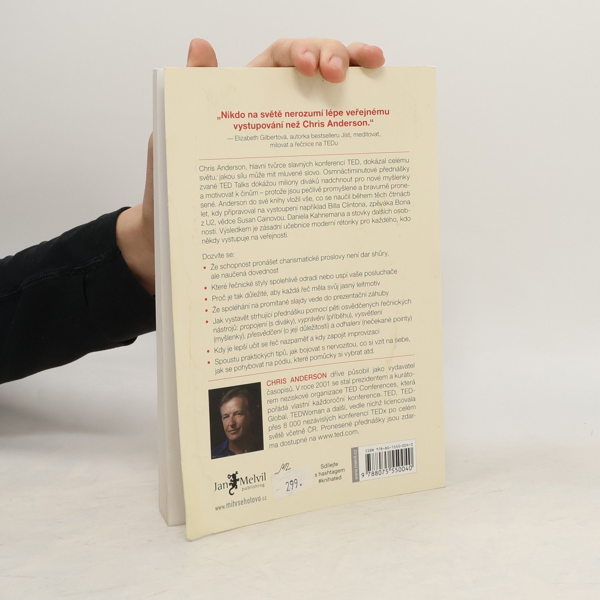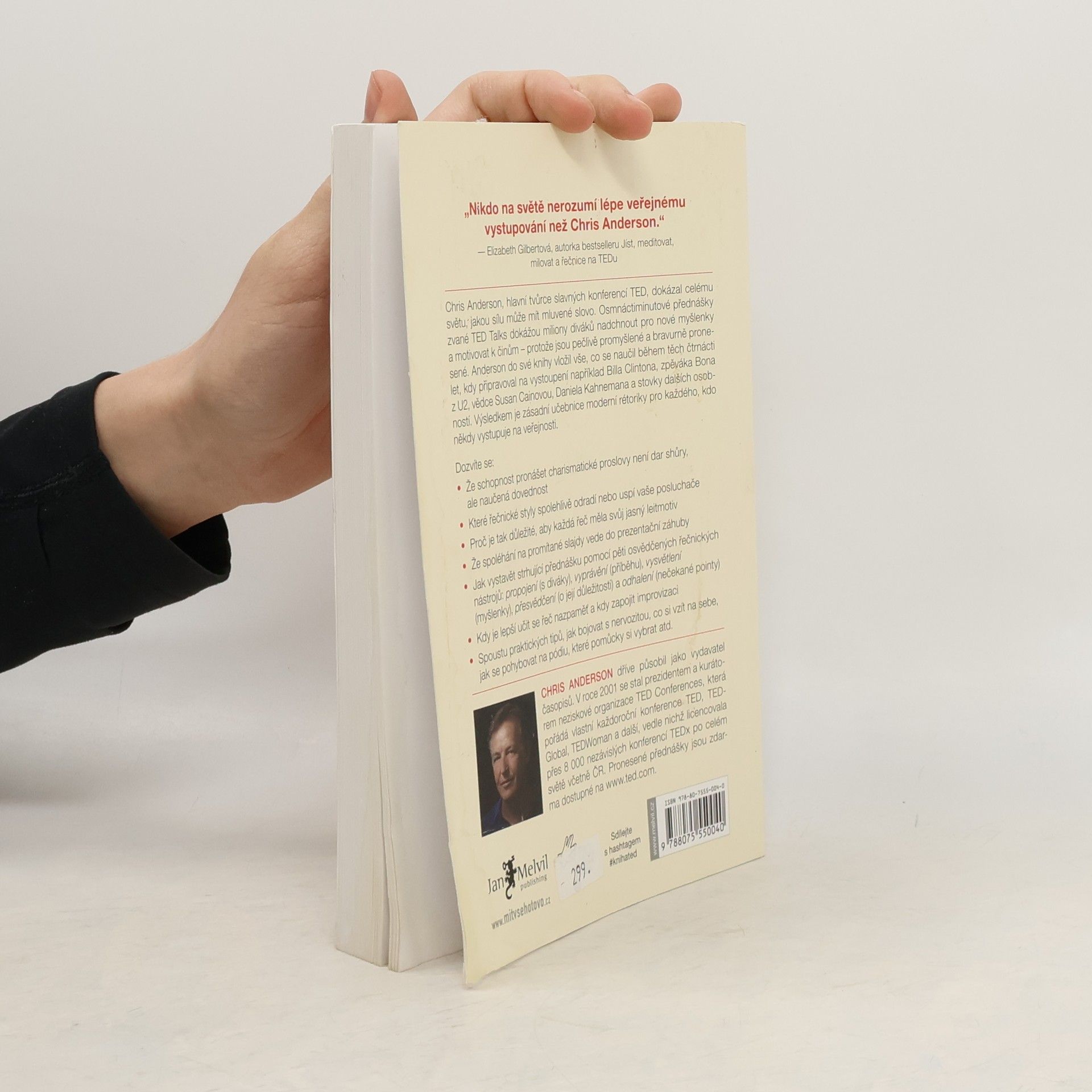 Chris Anderson, hlavní tvůrce TED konferencí, ukazuje sílu mluveného slova prostřednictvím osmnáctiminutových TED Talks, které inspirují miliony lidí po celém světě. Tyto přednášky dokážou změnit postoje a motivovat k činům, přičemž důkazem je, že mluvená řeč může být silnější než psaný text, pokud je pečlivě promyšlená a bravurně pronesená. Anderson se rozhodl proměnit posluchače v rétory a do své knihy zahrnul zkušenosti z čtrnáctileté praxe, během níž připravoval vystoupení známých osobností jako Bill Clinton, Bono či Kenneth Robinson. Naučil se, jak efektivně uchopit téma, pracovat s pozorností diváků a vystavět pointu. Elizabeth Gilbertová, spisovatelka a řečnice na TEDu, mu vzdává hold jako expertovi na veřejný projev. V této stručné, ale hutné knize odhaluje pět klíčových technik úspěšného řečníka: spojení s publikem, vyprávění příběhu, objasnění myšlenky, přesvědčení o její síle a odhalení pointy. Dále varuje před běžnými chybami a odpovídá na praktické otázky, jako co si obléct nebo jak se zbavit nervozity. Mottem TED konference je „Myšlenky, které stojí zato šířit“. Andersonův průvodce vám ukáže, jak šířit ty vlastní.