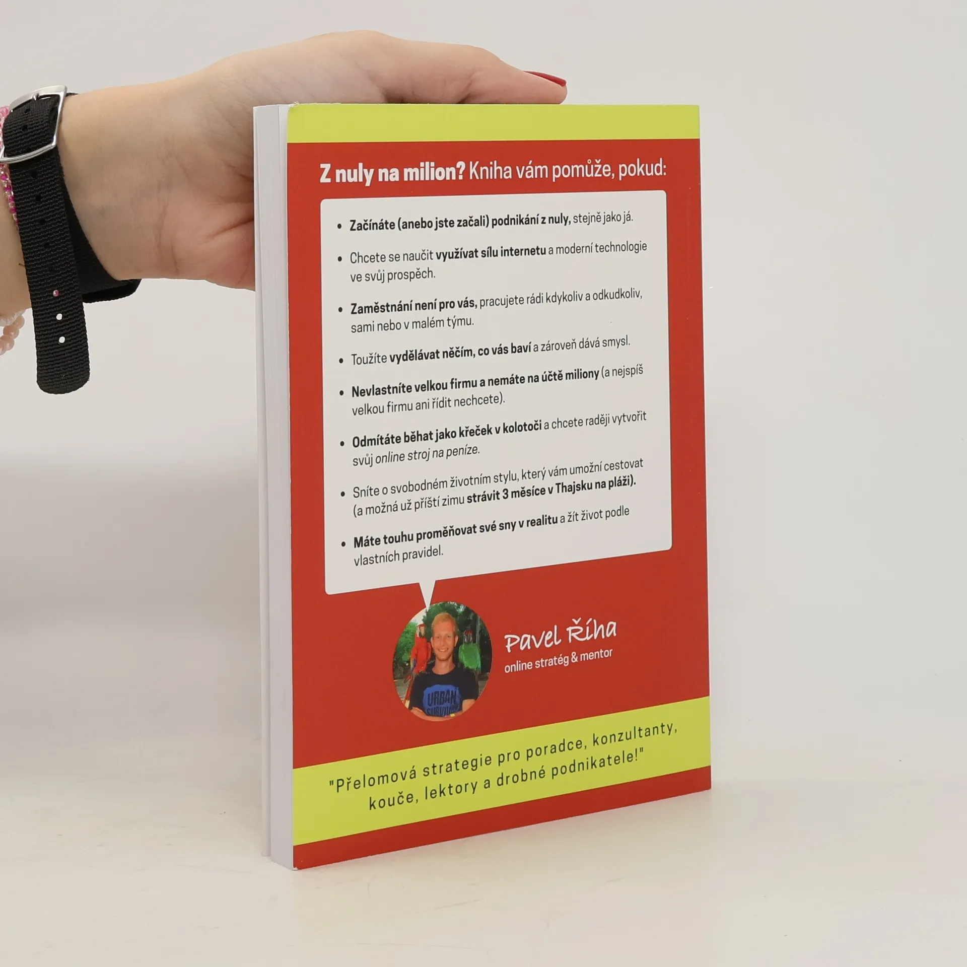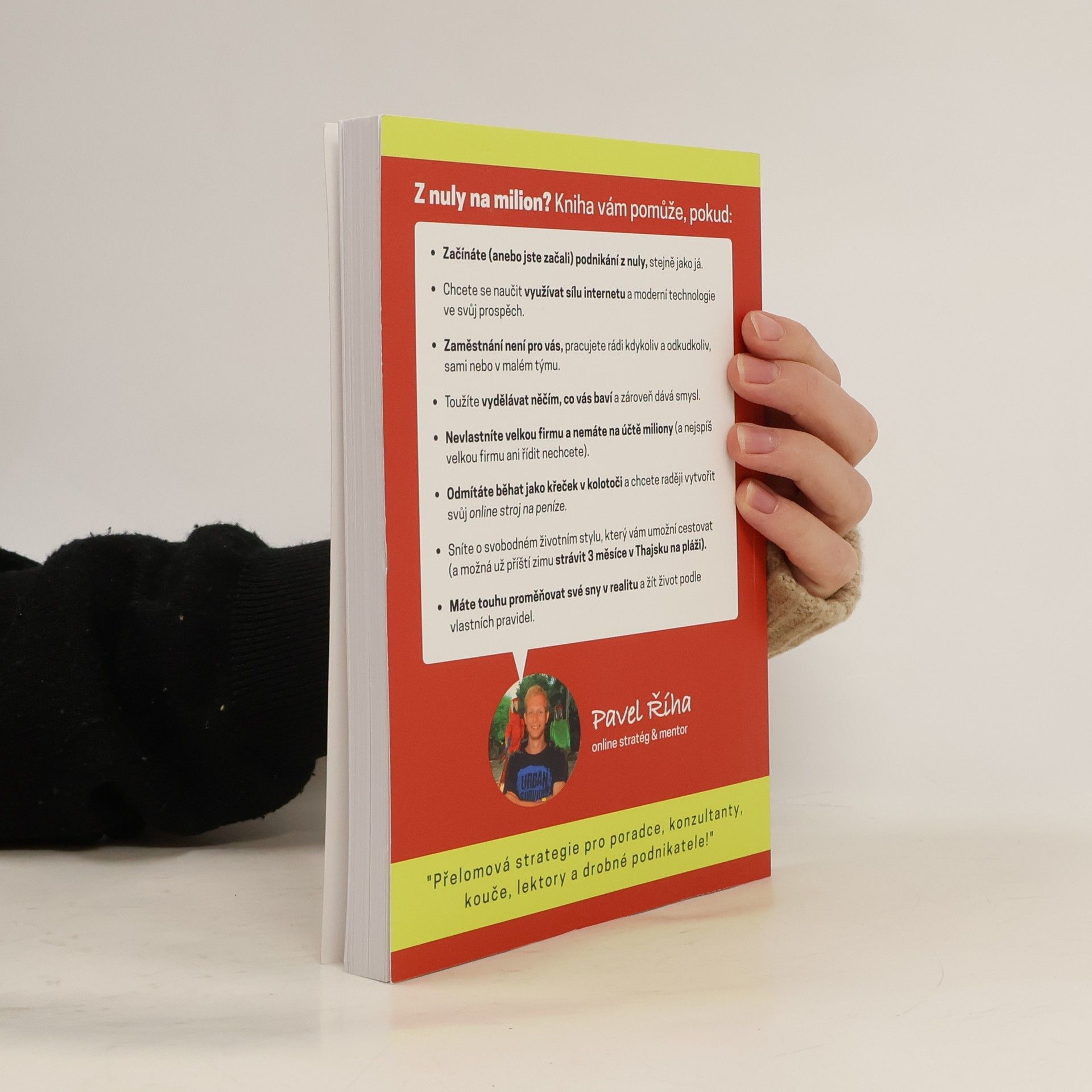 Neobvyklý návod, jak vydělat přes internet (první) milion a víc... Kniha vám pomůže, pokud: - Začínáte (anebo jste začali) podnikání z nuly, stejně jako já. - Chcete se naučit využívat sílu internetu a moderní technologie ve svůj prospěch (a dosáhnout finanční i časové svobody). - Zaměstnání není pro vás, pracujete rádi kdykoliv a odkudkoliv, sami nebo v malém týmu. - Toužíte vydělávat něčím, co vás baví a zároveň dává smysl. - Nevlastníte velkou firmu a nemáte na účtě miliony (a nejspíš velkou firmu ani řídit nechcete). - Odmítáte běhat jako křeček v kolotoči a chcete raději vytvořit svůj online stroj na peníze. - Sníte o svobodném životním stylu, který vám umožní cestovat a možná už příští zimu strávit v Thajsku na pláži (nebo celé léto na chatě a v lese s rodinou).
