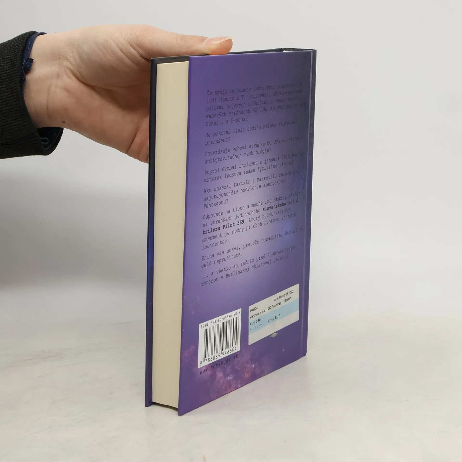 Čo spája incidenty amerických lietadlových lodí Nimitz a T. Roosevelt, zdokumentované pilotmi bojových stíhačiek a zverejnené na webových stránkach MO USA, so svätými knihami Genesis a Exodus? Je pokrvná línia Ježiša Krista skutočne prerušená? Potvrdzuje webová stránka MO USA existenciu antigravitačnej technológie? Poprel Gimbal incident z januára 2015 všetky doteraz ľudstvu známe fyzikálne zákony? Ako dokázal taxikár z Marseille zalarmovať najutajenejšie oddelenie amerického Pentagonu? Odpovede na tieto a mnohé iné otázky nájdete na stránkach jedinečného slovenského sci-fi trileru PILOT 369, ktorý beletristicky dokumentuje možný priebeh svetovo známych incidentov. Kniha Pilot 369 vás unaví, pretože nezaspíte, dokiaľ ju celú neprečítate.… a všetko sa začalo pred Rembrandtovým obrazom v Berlínskej obrazovej galérii.