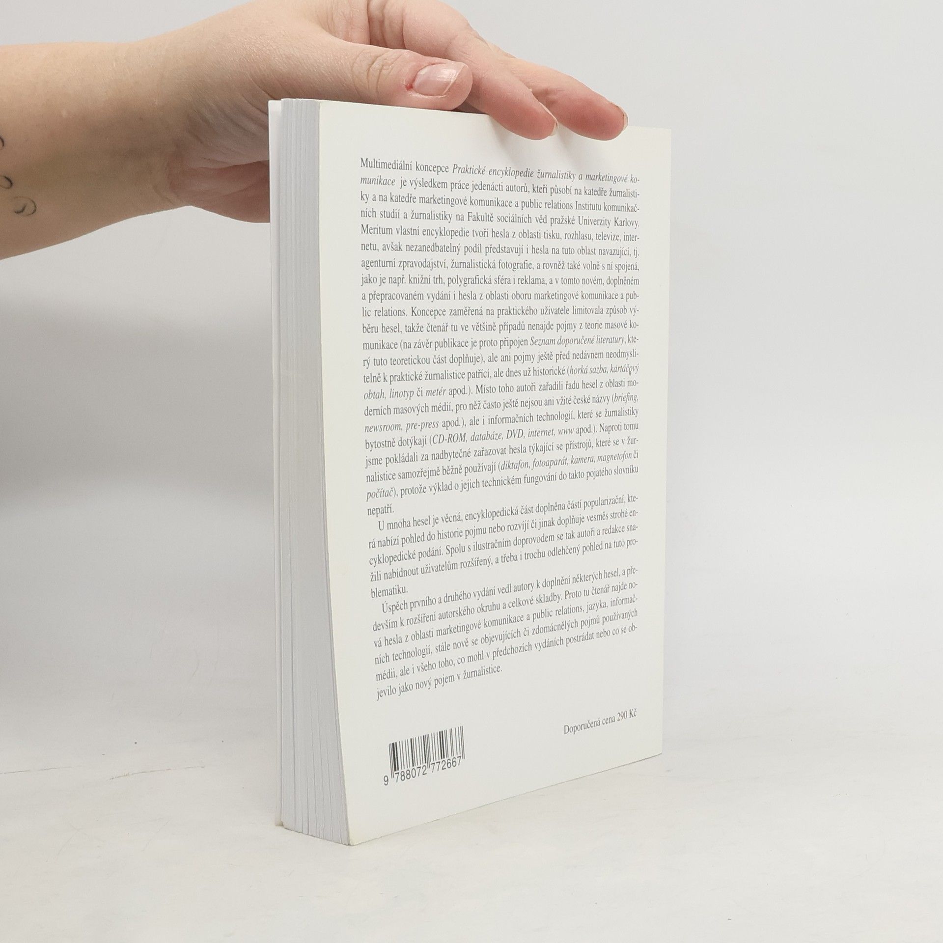 Třetí, aktualizované a podstatně rozšířené vydání úspěšného titulu Praktická encyklopedie žurnalistiky bylo obohaceno jak o další hesla z dosud zařazených oborů (tisk, elektronická média, informační technologie atd.), tak o celý nový obor, který se týká marketingu, jeho strategie i každodenní praxe v médiích. Autorský kolektiv pracovníků Fakulty sociálních věd UK tak připravil užitečnou příručku nejen pro studenty těchto oborů, ale i pro pracovníky všech médií a zájemce o stále se rozvíjející a měnící se mediální a marketingovou sféru.