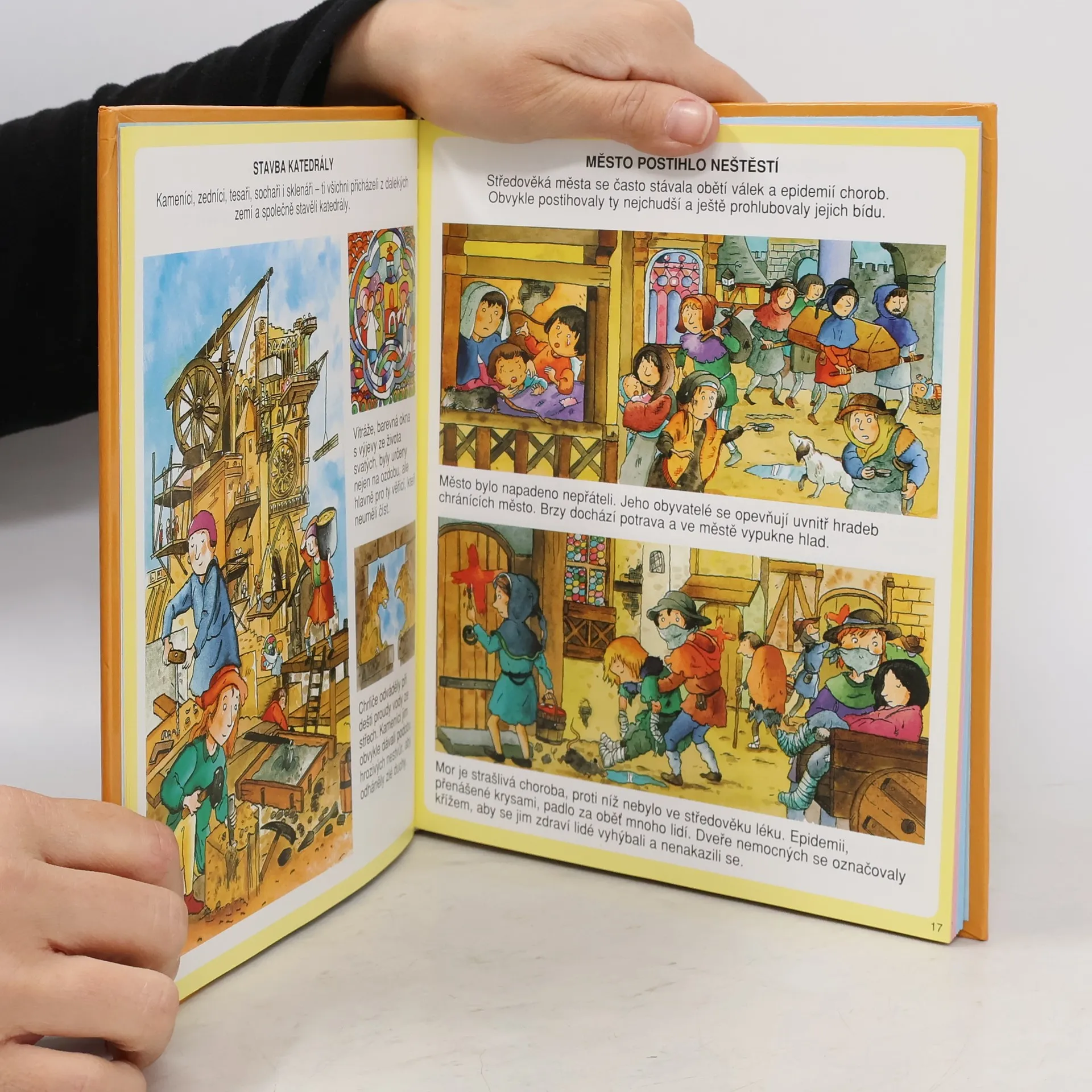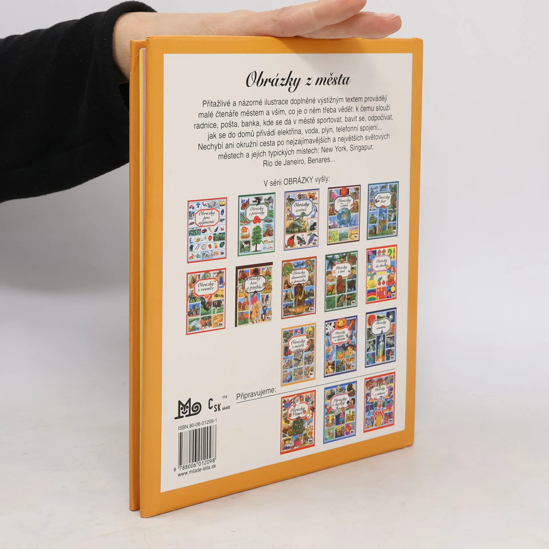 Přitažlivé a názorné ilustrace doplněné výstižným textem provádějí malé čtenáře městem a vším, co je o něm třeba vědět: k čemu slouží radnice, pošta, banka, kde se dá v městě sportovat, bavit se, odpočívat, jak se do domů přivádí elektřina, voda, plyn, telefonní spojení... Nechybí ani okružní cesta po nejzajímavějších a největších světových městech a jejich typických místech: New York, Singapur, Rio de Janeiro, Benares...