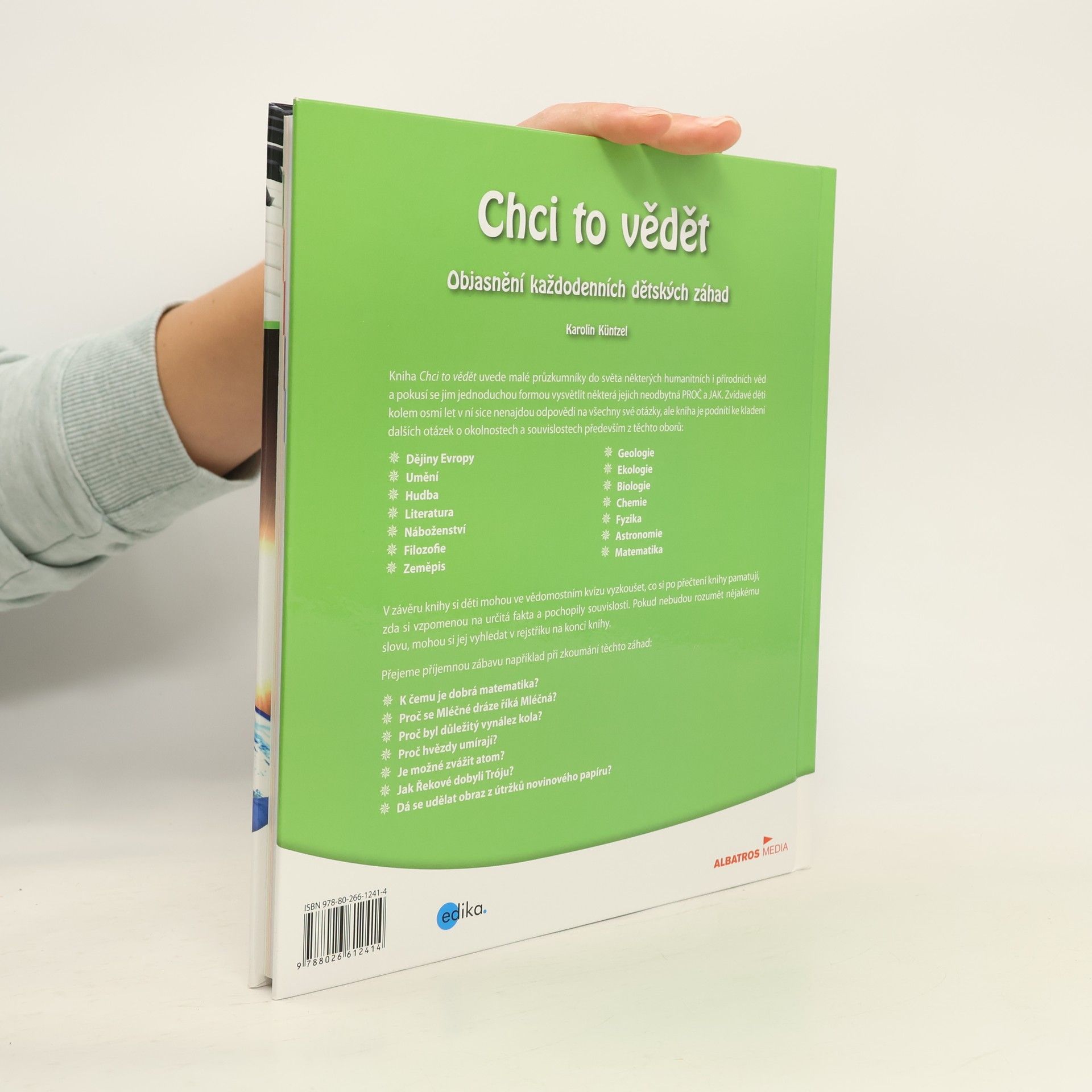 Kniha Chci to vědět uvede malé průzkumníky do světa některých humanitních i přírodních věd, pokusí se jim jednoduchou formou vysvětlit některá jejich neodbytná PROČ a JAK. Zvídavé děti kolem osmi let v ní sice nenajdou odpovědi na všechny své otázky, kniha je spíše podnítí k dalšímu dotazování se po okolnostech a souvislostech především z těchto oborů: Dějiny Evropy Umění Hudba Literatura Náboženství Filozofie Zeměpis Geologie Ekologie Biologie Chemie Fyzika Astronomie Matematika V závěru knihy si děti ve vědomostním kvízu mohou vyzkoušet, co si po přečtení knihy pamatují, zda si vzpomenou na určitá fakta a pochopily souvislosti. Pokud nebudou rozumět nějakému slovu, mohou si jej vyhledat v rejstříku na konci knihy. Přejeme příjemnou zábavu při zkoumání záhad: K čemu je matematika dobrá? Proč se Mléčné dráze říká mléčná? Proč byl důležitý vynález kola? Proč hvězdy umírají? Je možné zvážit atom? Jak dobyli Řekové Tróju? Dá se udělat obraz z útržků novinového papíru?