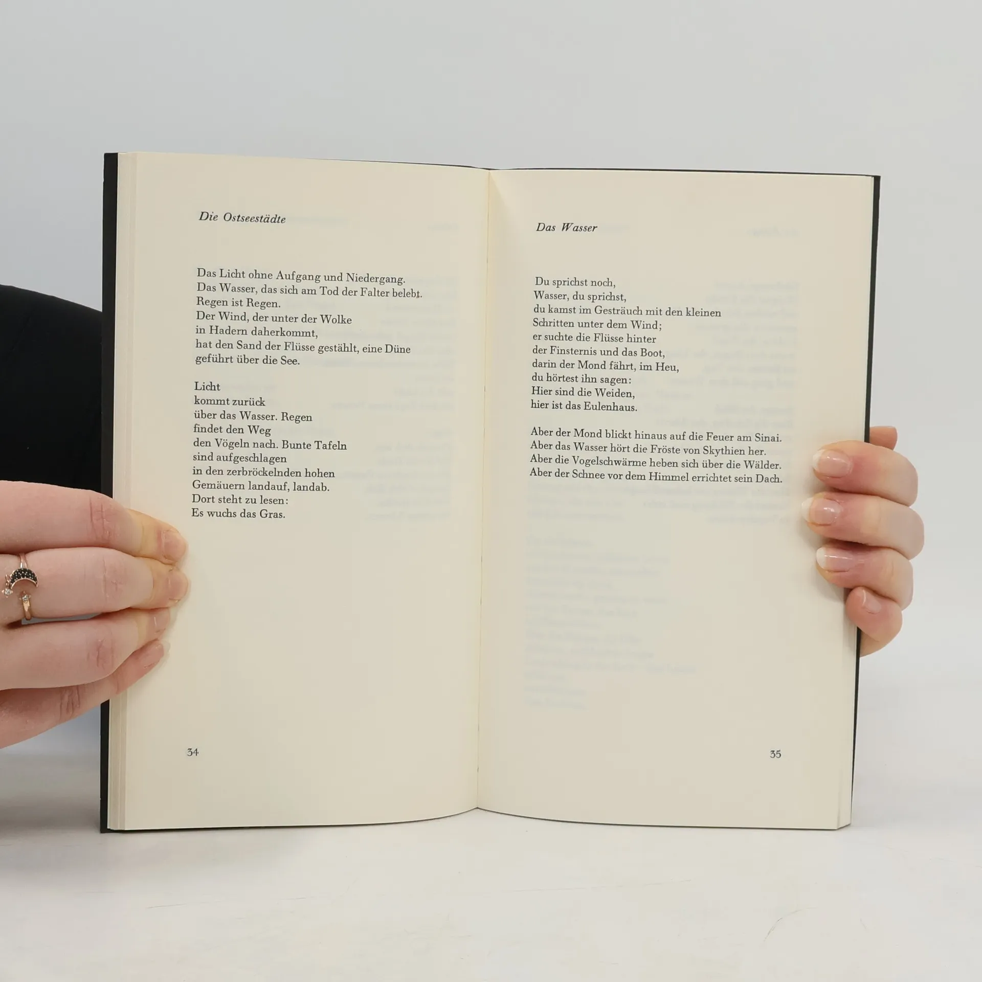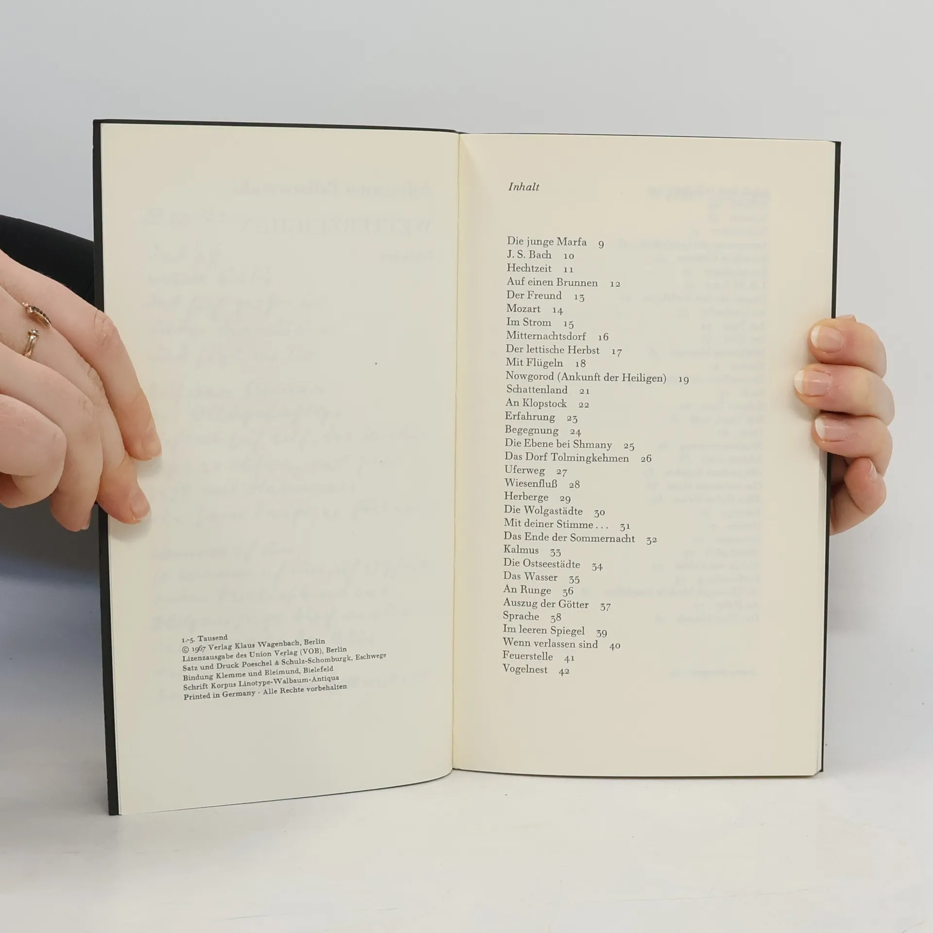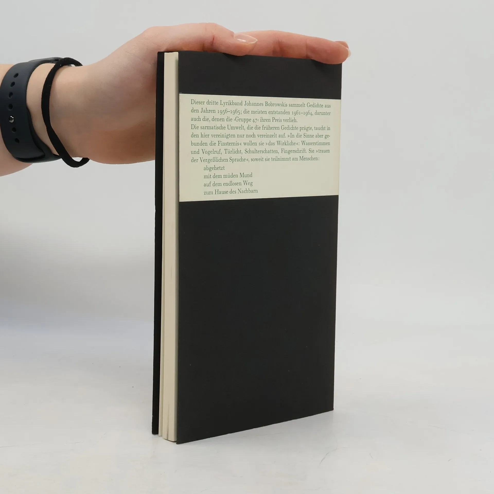 Dieser dritte Lyrikband Johannes Bobrowskis sammelt Gedichte aus den Jahren 1956—1965; die meisten entstanden 1961—1964, darunter auch die, denen die ›Gruppe 47‹ ihren Preis verlieh.Die sarmatische Umwelt, die die früheren Gedichte prägte, taucht in den hier vereinigten nur noch vereinzelt auf. »In die Sinne aber gebunden die Finsternis« wollen sie »das Wirkliche«: Wasser-stimmen und Vogelruf, Türlicht, Schulterschatten, Fingerschrift. Sie »trauen der Vergeßlichen Sprache«, soweit sie teilnimmt am Menschen:AbgehetztMit dem müden MundAuf dem endlosen WegZum Hause des Nachbarn