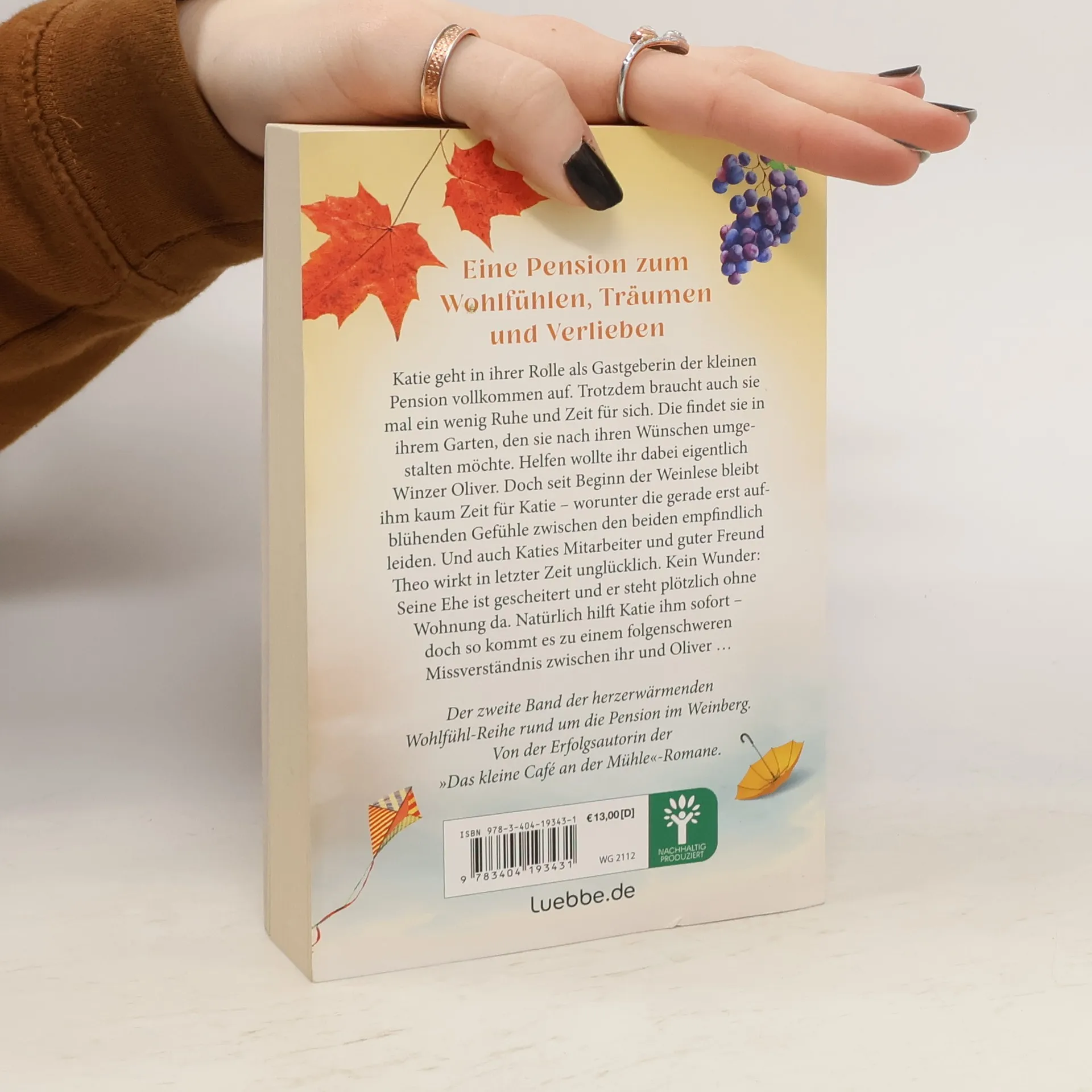 In "Eine Pension zum Verlieben" widmet sich Katie leidenschaftlich ihrer Pension und ihrem Garten. Während Winzer Oliver mit der Weinlese beschäftigt ist, entwickeln sich zwischen ihnen zarte Gefühle. Katies Freund Theo hat mit persönlichen Problemen zu kämpfen, was zu Missverständnissen führt. Ein romantisches Lesevergnügen in den Weinbergen der Mosel.