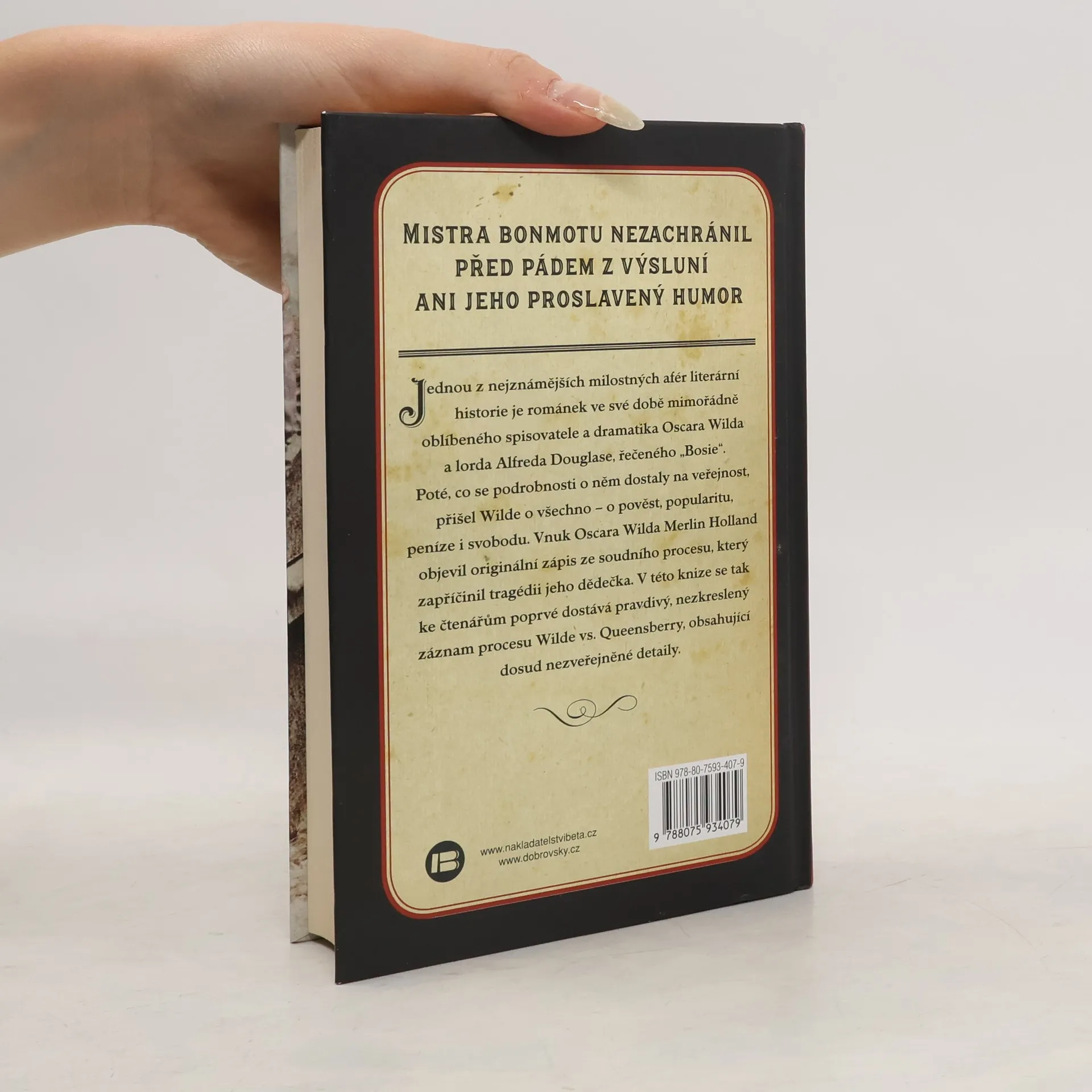 Mistra bonmotu nezachránil před pádem z výsluní ani jeho proslavený humor Jednou z nejznámějších milostných afér literární historie je románek ve své době mimořádně oblíbeného spisovatele a dramatika Oscara Wilda a lorda Alfreda Douglase, řečeného „Bosie“. Poté, co se podrobnosti o něm dostaly na veřejnost, přišel Wilde o všechno – o pověst, popularitu, peníze i svobodu. Vnuk Oscara Wilda Merlin Holland objevil originální zápis ze soudního procesu, který zapříčinil tragédii jeho dědečka. V této knize se tak ke čtenářům poprvé dostává pravdivý, nezkreslený záznam procesu Wilde vs. Queensberry, obsahující dosud nezveřejněné detaily.