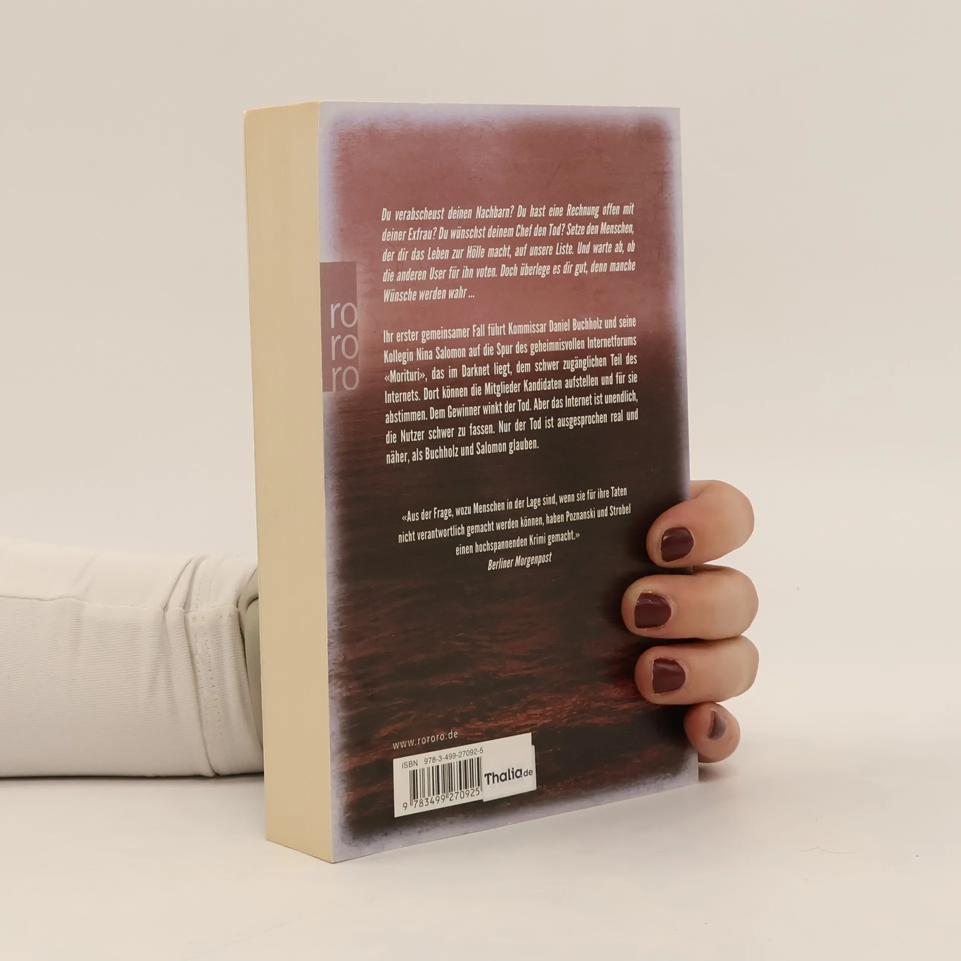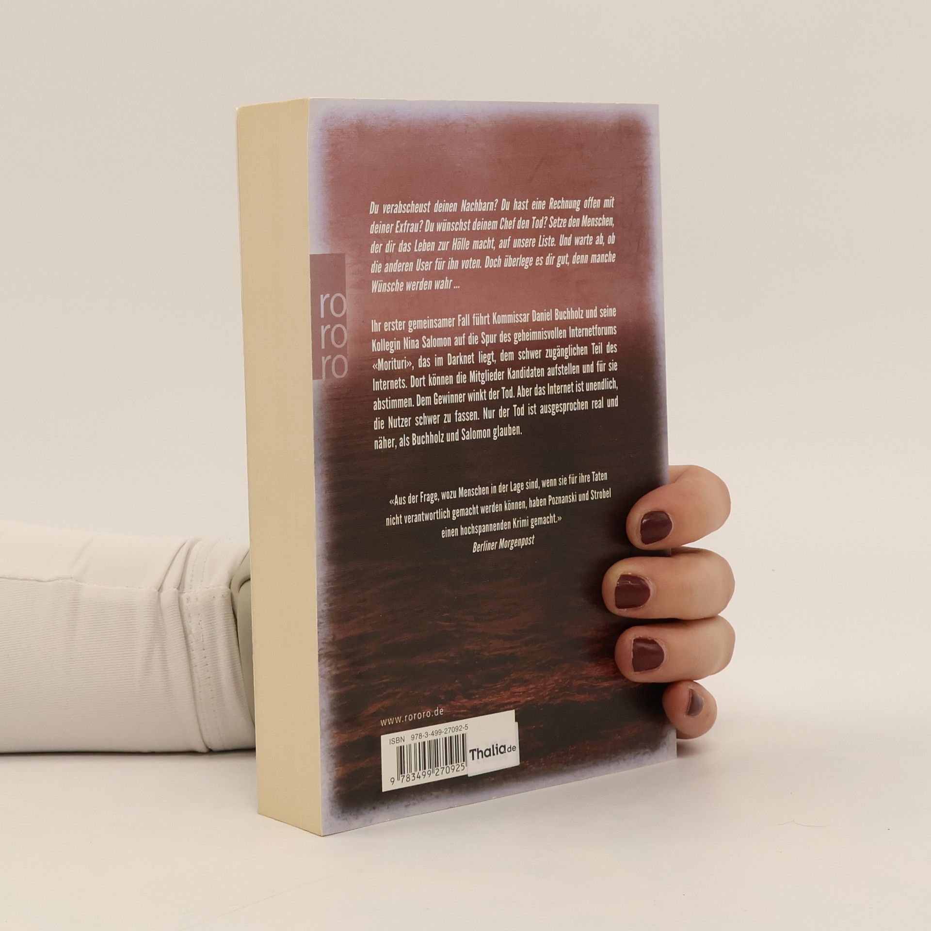 Du verabscheust deinen Nachbarn? Du hast eine offene Rechnung mit deiner Ex-Frau? Du wünschst deinem Chef den Tod? Dann setze ihn auf unsere Liste und warte, ob die anderen User für ihn voten. Aber überlege es dir gut, denn manchmal werden Wünsche wahr... Es ist der erste gemeinsame Fall von Kommissar Daniel Buchholz und seiner Kollegin Nina Salomon, und er führt sie auf die Spur des geheimnisvollen Internetforums «Morituri». Dort können die Mitglieder Kandidaten aufstellen und dann für sie abstimmen. Dem Gewinner winkt der Tod. Aber das Internet ist unendlich, die Nutzer schwer zu fassen. Nur der Tod ist ausgesprochen real, und er ist näher, als Buchholz und Salomon glauben ...
