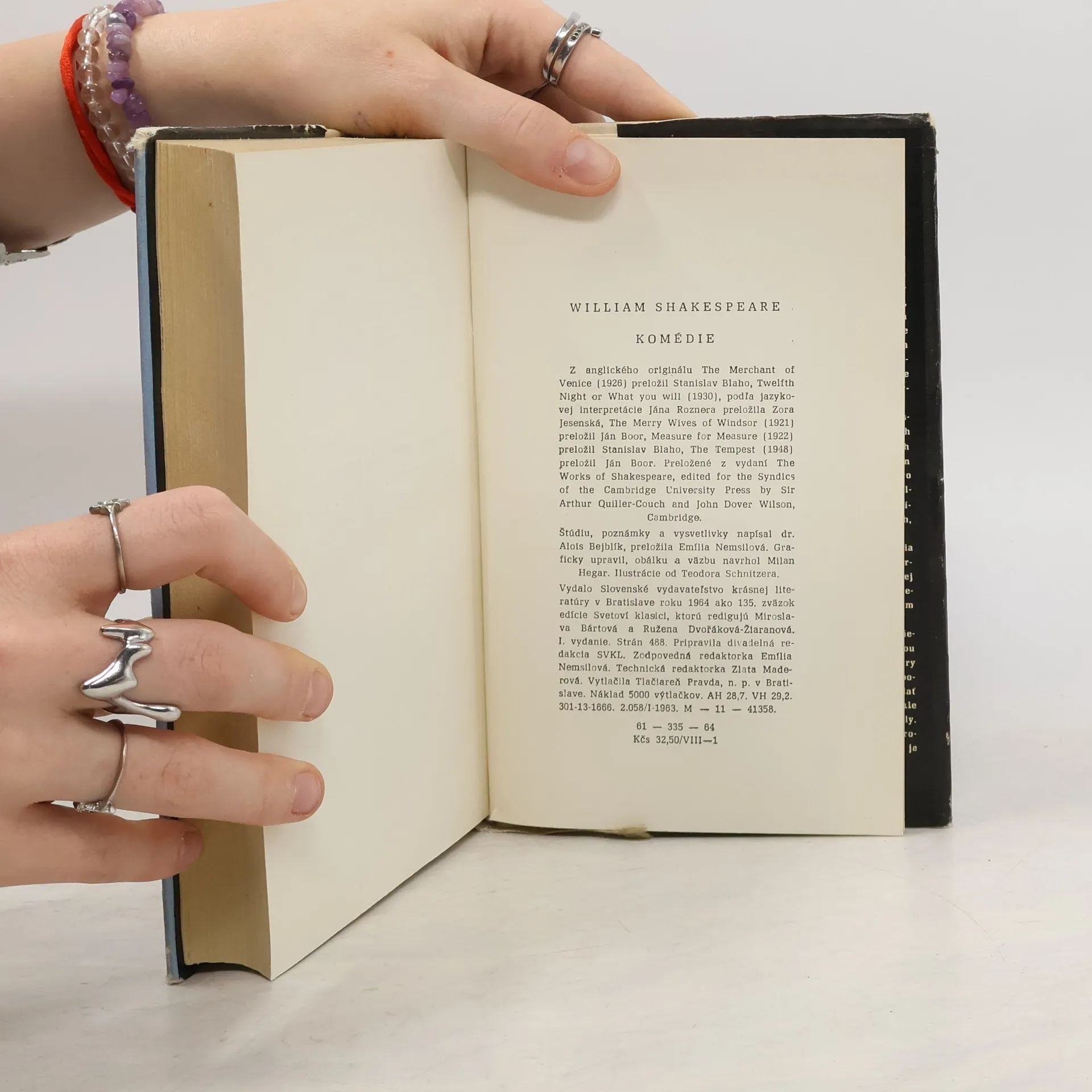 Obsah: Kupec benátsky, Večer trojkráľový alebo Čo len chcete, Veselé panie windsorské, Oko za oko, Búrka, Shakespearove komédie (štúdia dr. Alois Bejblík), Poznámky a vysvetlivky