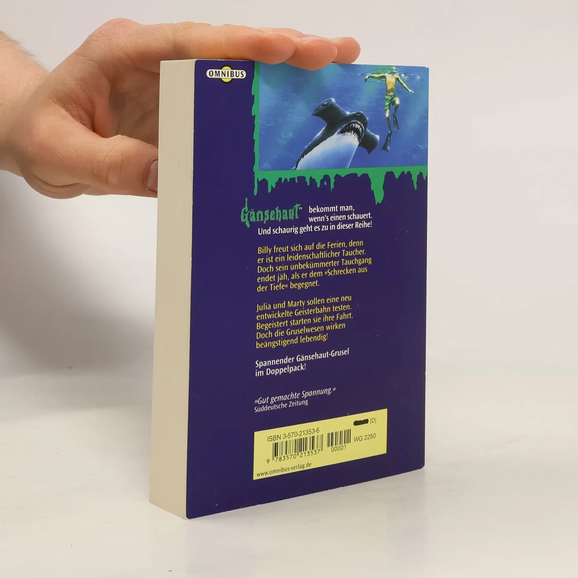 Enthält die Gänsehaut-Einzelbände »Der Schrecken, der aus der Tiefe kam« (Band 17) und »Endstation Gruseln« (Band 18). »Der Schrecken, der aus der Tiefe kam« Billy und seine jüngere Schwester Sheena verbringen die Sommerferien auf dem Forschungsschiff ihres Onkels, eines berühmten Meeresbiologen. Beim Schnorcheln wird Billy plötzlich von einem Hai angegriffen. Aber bevor dieser ihm etwas antun kann, wird er von einem rätselhaften Wesen vertrieben - von einer Meerjungfrau… »Endstation Gruseln« Julia und ihr bester Freund Marty sind begeistert: sie sollen eine neu entwickelte Geisterbahn testen. Ihre Fahrt beginnt zwar eher harmlos, aber bald geraten die beiden in haarsträubende Situationen. Sind das die beabsichtigten Gruseleffekte, oder hat sich ein gefährlicher Fehler in das Programm geschlichen?