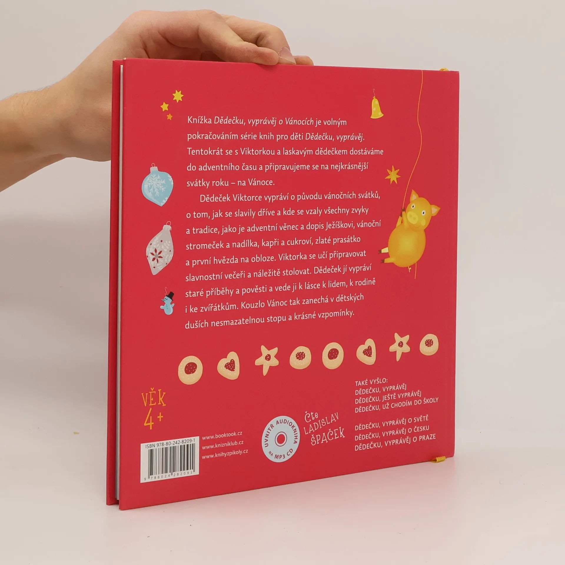 Knížka Dědečku, vyprávěj o Vánocích je volným pokračováním série knih pro děti Dědečku, vyprávěj. Tentokrát se s Viktorkou a laskavým dědečkem dostáváme do adventního času a připravujeme se na nejkrásnější svátky roku – na Vánoce. Nejvíce prožívají kouzlo Vánoc ti nejmenší. Milují tajuplné legendy, jsou okouzleni rozzářeným vánočním stromečkem, vnímají vážnost štědrovečerní večeře, baví je vánoční zvyky a netrpělivě se těší na dárky, které jim Ježíšek přinese. Dědeček Viktorce vypráví o původu vánočních svátků, o tom, jak se slavily dříve, kde se vzaly všechny zvyky a tradice, jako je adventní věnec a dopis Ježíškovi, vánoční stromeček a nadílka, kapři a cukroví, zlaté prasátko a první hvězda na obloze. Viktorka se učí připravovat slavnostní večeři a náležitě stolovat. Dědeček jí vypráví staré příběhy a pověsti a vede ji k lásce k lidem, k rodině i ke zvířátkům. Při poslechu nebo čtení knížky děti podlehnou kouzlu Vánoc a budou je prožívat ještě silněji než dřív.