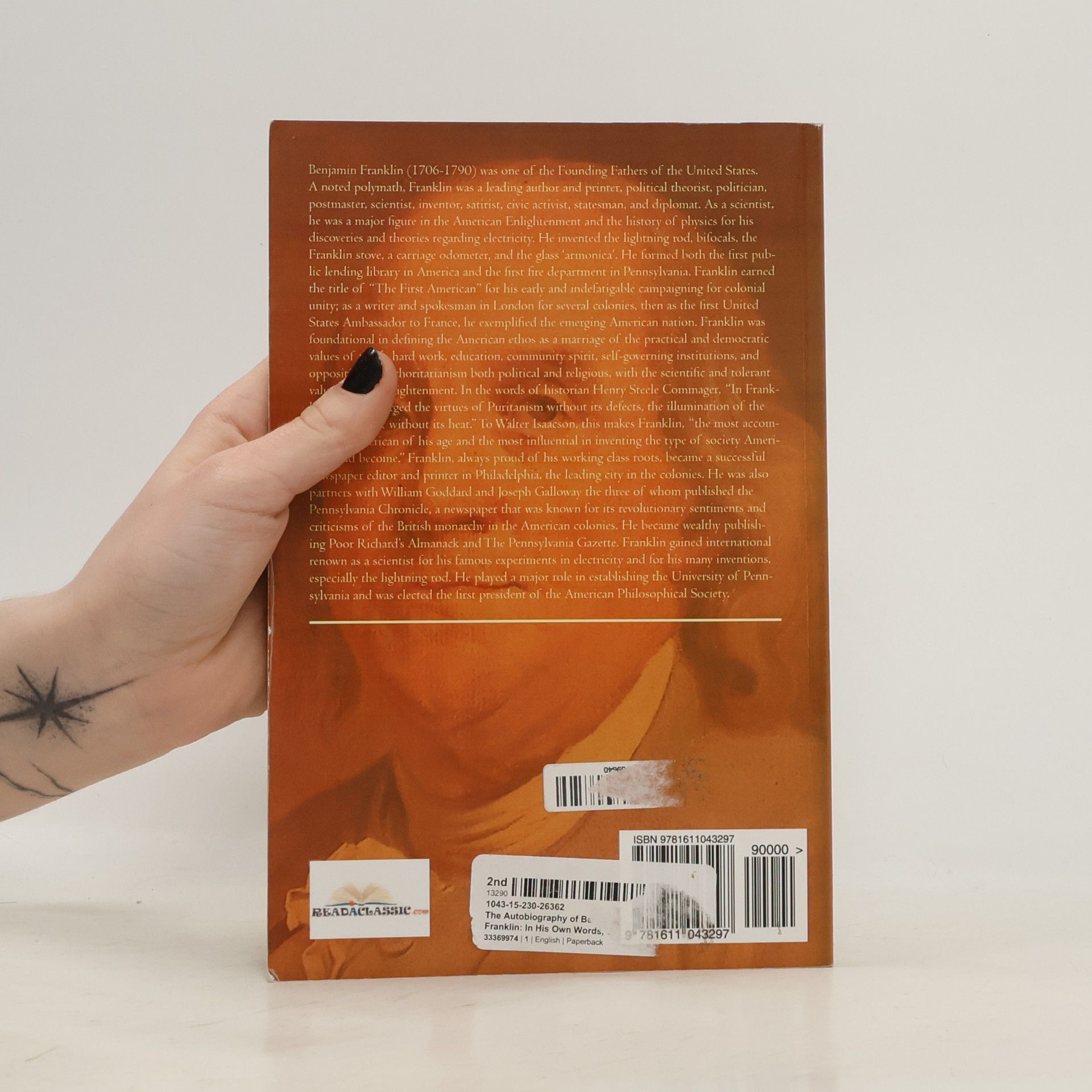 The Autobiography of Benjamin Franklin details the life of this famous Founding Father, inventor, philosopher, satirist, political theorist, statesman, and diplomat. Franklin's irreverent, yet intelligent and pure-intentioned, thoughts on life shaped the idea of what it means to be both a free thinker and a United States citizen. Follow the accomplishments of this influential man in his own words, and discover a life well spent.