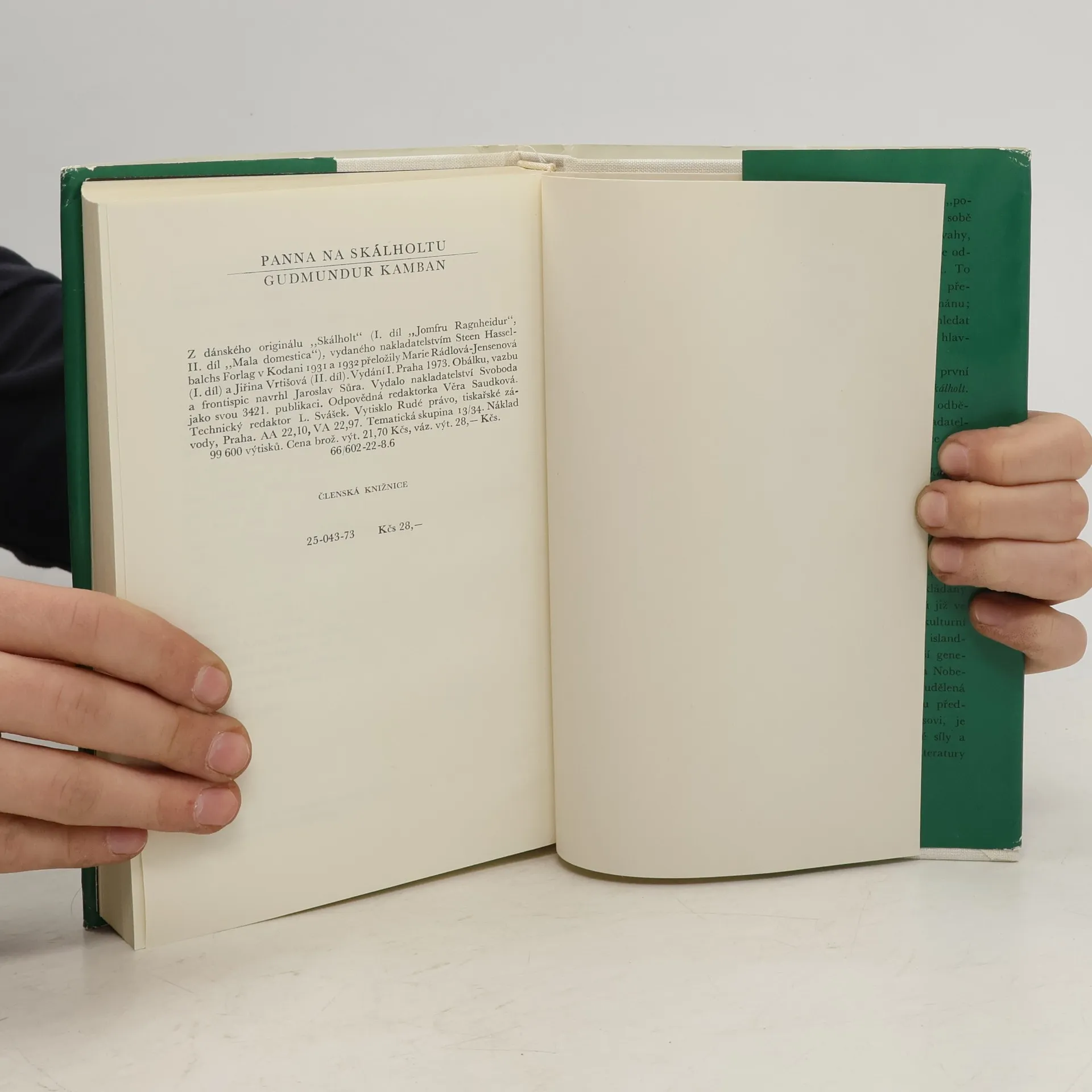 První dva díly (Panna Ragnheidur, Mala domestica) čtyřdílného románového cyklu Skálholt významného představitele zakladatelské generace moderní islandské literatury (1888-1945). Široce koncipovaná sága o tragické lásce dcery islandského biskupa je vyprávěna podle skutečného příběhu z druhé poloviny 17. století. Hrdinka se odmítá provdat za muže ze vznešeného a bohatého rodu, kterého jí zvolil otec, a podléhá svodu mladého kněze a má s ním dítě.Nepochopení a nepřátelství otce pro tento domněle hříšný čin přerušuje jen její nemoc a nakonec smrt. 25-043-73