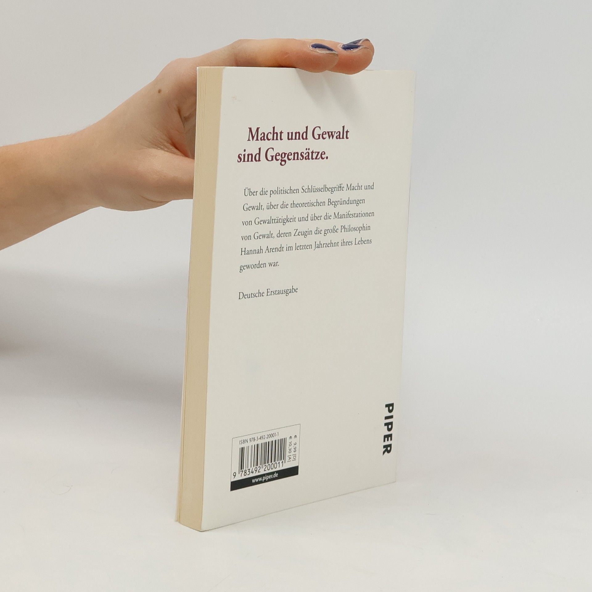 Hannah Arendt hat dieses Buch, das 1970 erstmals erschien, im Angesicht des Vietnamkrieges und unter dem Eindruck weltweiter Studentenunruhen geschrieben. In diesem Essay zeigt sie die Abgrenzungen und Überschneidungen der politischen Schlüsselbegriffe Macht und Gewalt. Sie analysiert die theoretischen Begründungen von Gewalttätigkeit und die gewalttätigen Aktionen in Vietnam, in den Rassenkonflikten der USA und bei den Studentenrevolten in aller Welt. Die alte Theorie von Krieg und Gewalt als Ultima ratio der Macht wurde – wenigstens im zwischenstaatlichen Bereich – durch die Kernwaffen ad absurdum geführt. Hannah Arendt formuliert scharf und provozierend aus unserer Wirklichkeit gewonnene Erkenntnisse über die Funktionen von Macht und Gewalt in der Politik