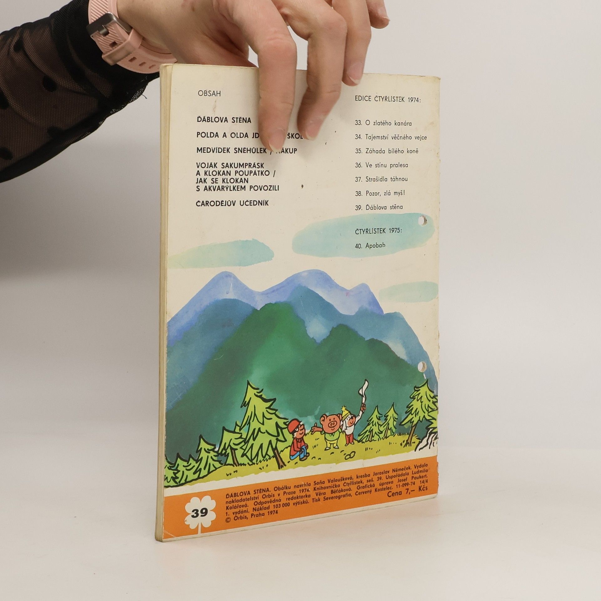 39. díl série. Ďáblova stěna - Ljuba Štíplová, Jaroslav Němeček. Polda a Olda jsou sami doma - Petr Chvojka, Jaroslav Malák. Medvídek Sněhůlek - Nákup s ledním medvědem - Marie Kšajtová, Zdeňka Krejčová. Voják Sakumprásk a klokan Poupátko - Jak se klokan s akvarýlkem povozil - Jiří Kafka, František Foltýn. Čarodějův učedník - Václav Junek, Ivo Šedivý.