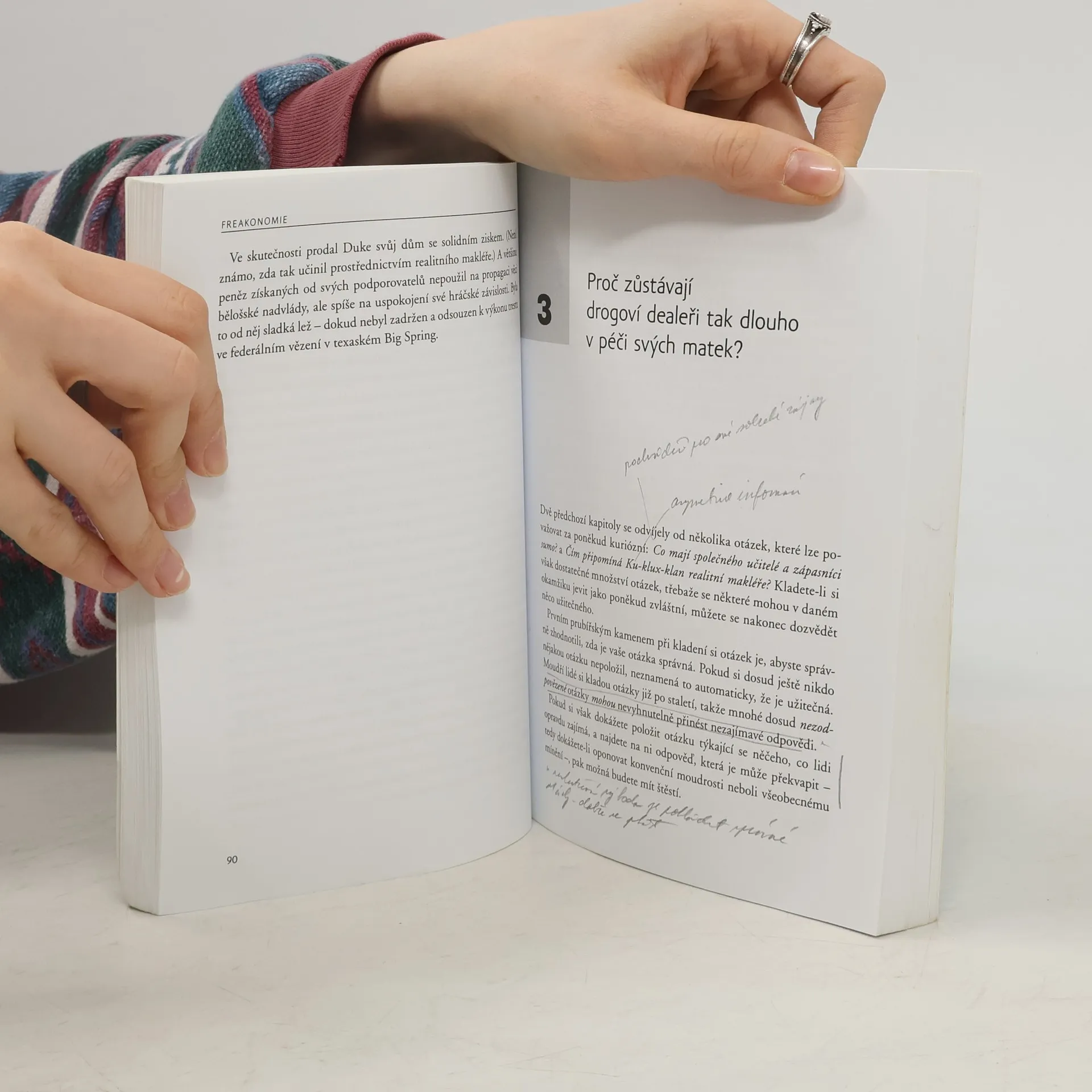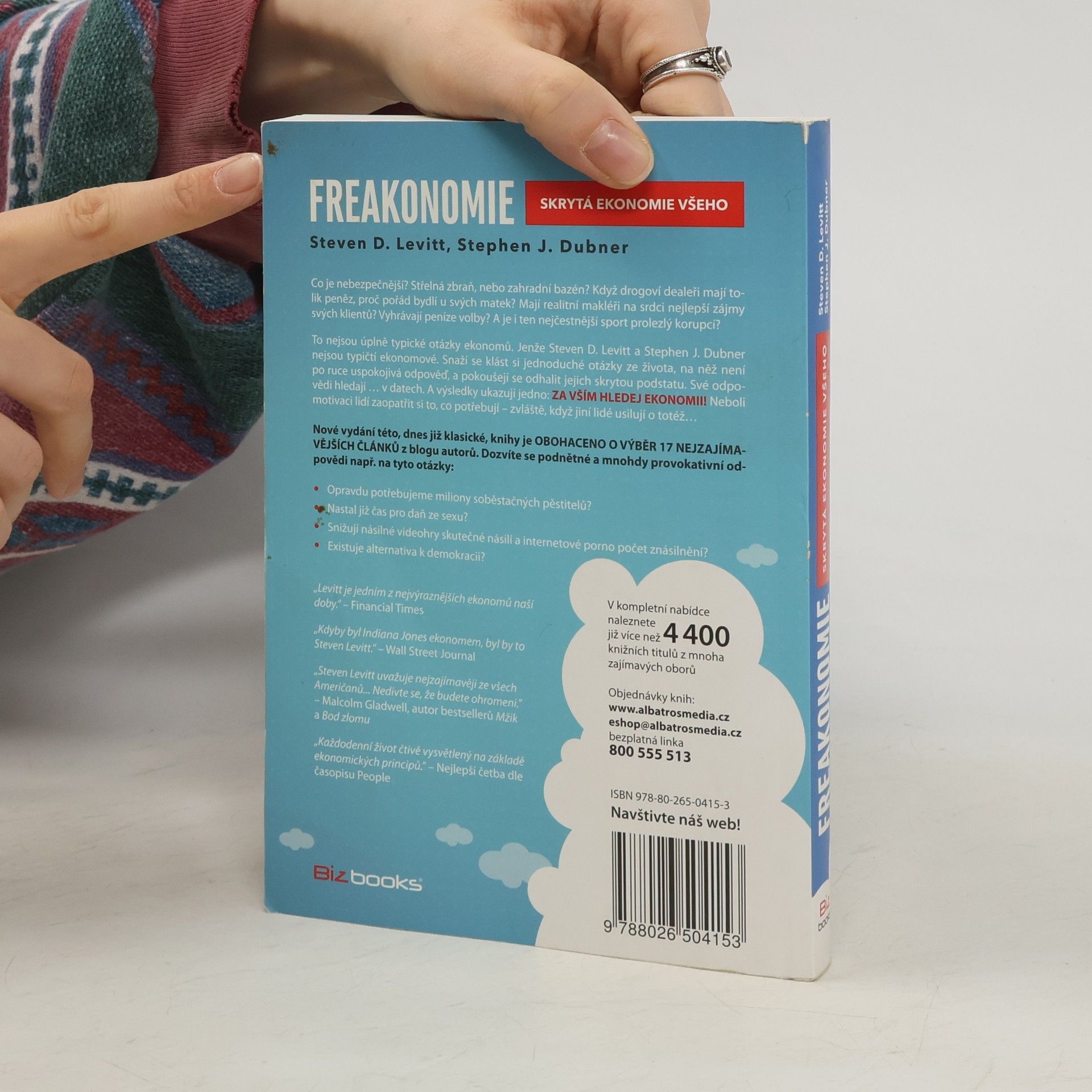 Freakonomie, Skrytá ekonomie všeho Co je nebezpečnější? Střelná zbraň nebo zahradní bazén? Když drogoví dealeři mají tolik peněz, proč pořád bydlí u svých matek? Že podvádějí žáci, je známá věc, ale nepodvádějí někdy také učitelé? A je i ten nejčestnější sport prolezlý korupcí? To nejsou úplně typické otázky ekonomů. Jenže Steven D. Levitt a Stephen J. Dubner nejsou typičtí ekonomové. Snaží se klást si jednoduché otázky ze života, na něž není po ruce uspokojivá odpověď, a pokoušejí se odhalit jejich skrytou podstatu. Své odpovědi hledají … v datech. A výsledky ukazují jedno: ZA VŠÍM HLEDEJ EKONOMII! Neboli motivaci lidí zaopatřit si to, co potřebují – zvláště, když jiní lidé usilují o totéž… Nové vydání této, dnes již klasické, knihy je OBOHACENO O VÝBĚR 17 NEJZAJÍMAVĚJŠÍCH ČLÁNKŮ z blogu autorů. Dozvíte se podnětné a mnohdy provokativní odpovědi např. na tyto otázky: • Opravdu potřebujeme miliony soběstačných pěstitelů? • Nastal již čas pro daň ze sexu? • Snižují násilné videohry skutečné násilí a internetové porno počet znásilnění? • Existuje alternativa k demokracii?