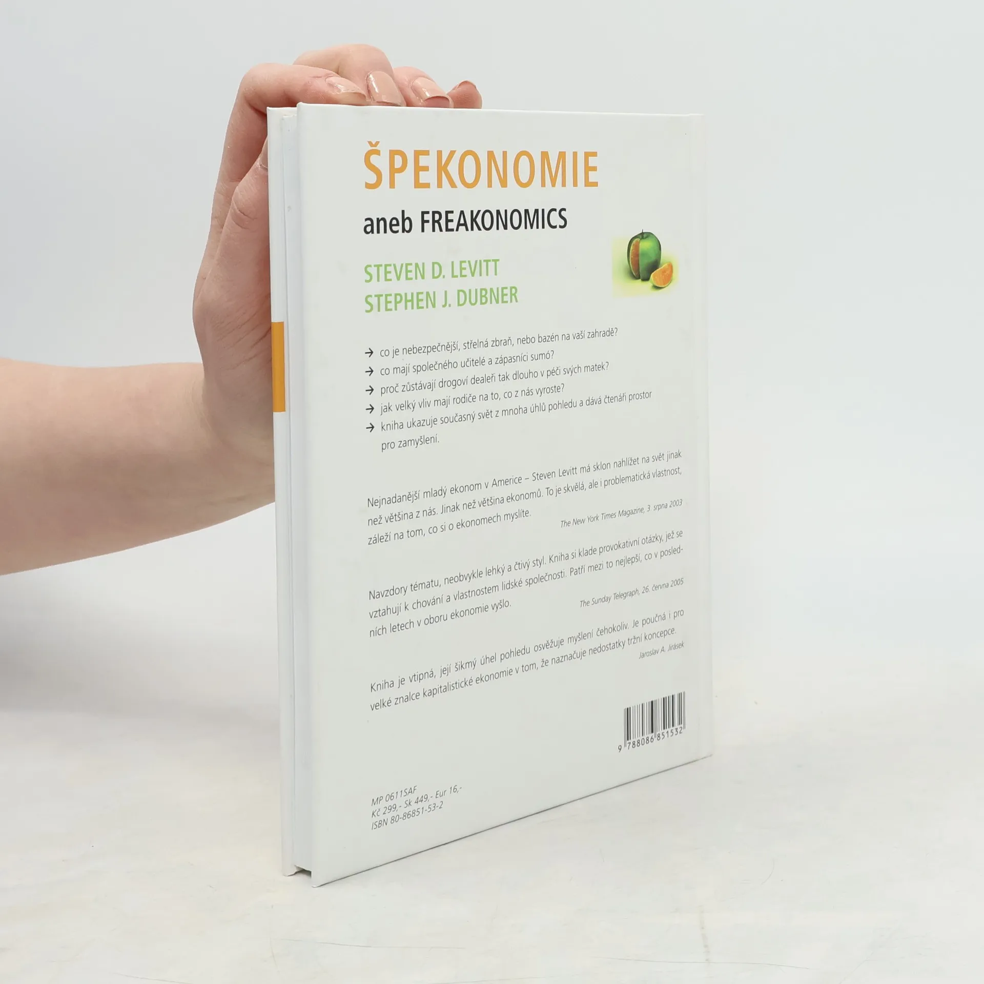 Co je nebezpečnější, střelná zbraň, nebo bazén na vaší zahradě? Co mají společného učitelé a zápasníci sumó? Proč zůstávají drogoví dealeři tak dlouho v péči svých matek? Jak velký vliv mají rodiče na to, co z nás vyroste? A jaký dopad měl rozsudek v případu Roeová versus Wade na zločinnost ve Spojených státech? To nejsou právě typické otázky, které si klade ekonom. Ale Steven D. Levitt není typickým ekonomem. Je to vědec, který řeší hádanky každodenního života - od podvodů a kriminality až po sport a výchovu dětí - a jehož závěry vyvracejí zažité představy. Začne to většinou hromadou čísel i údajů a jednoduchou otázkou, na kterou neexistuje uspokojivá odpověď. Některé otázky řeší záležitosti života a smrti, jiné znějí bláznivě (jsou to, lidově řečeno, špeky). Proto nové pole výzkumu, z něhož vychází tato kniha: špekonomie. V této knize se pokoušejí odhalit skrytou stránku... vlastně všeho. Jak funguje gang dealerů cracku. Jak přemýšlejí realitní makléři. Jak je to s financováním politické kampaně. Proč učitel vašeho dítěte podvádí. Nebo jaká tajemství má Ku Klux Klan...