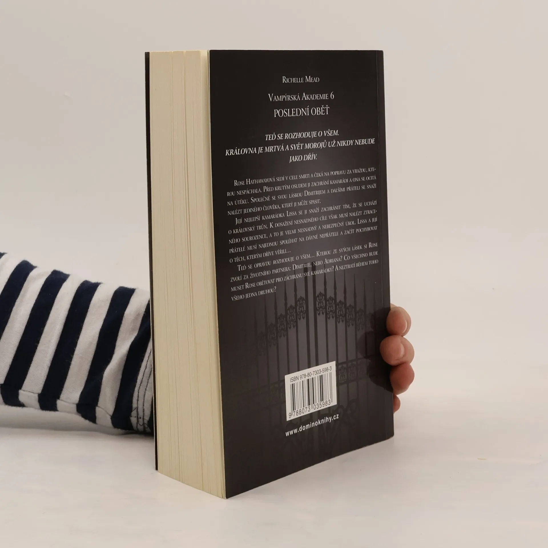 V šesté části série Vampýrské Akademie Poslední oběť od autorky Richelle Mead se rozhoduje o všem! Královna je mrtvá a svět Morojů už nikdy nebude jako dřív! Vražda. Láska. Zrada. A také poslední oběť, kterou je třeba přinést. Rose čelí obvinění z vraždy. Lissa chce uplatnit svůj nárok na královský trůn. Ne, teď už mezi nimi doopravdy nebude nic…