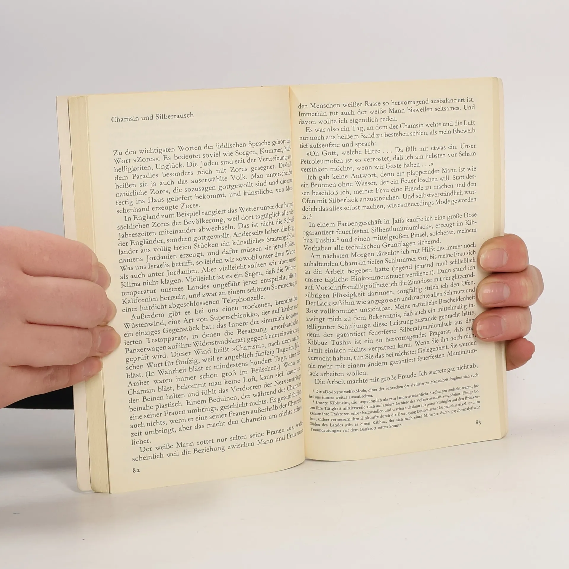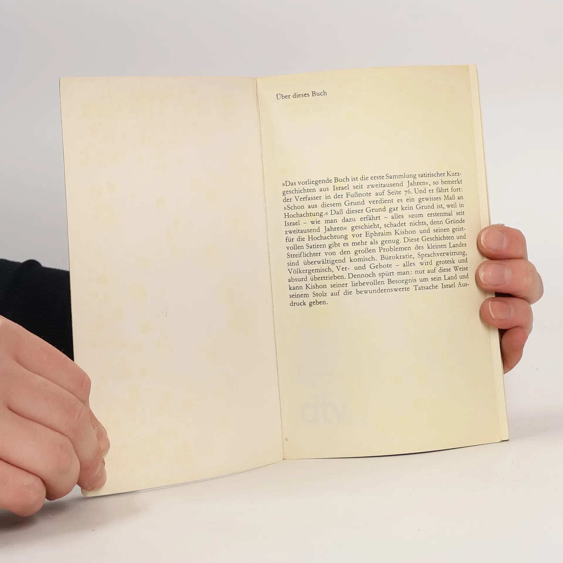 »Das vorliegende Buch ist die erste Sammlung satirischer Kurzgeschichten aus Israel seit zweitausend Jahren«, so bemerkt der Verfasser in der Fußnote auf Seite 76. Und er fährt fort: »Schon aus diesem Grund verdient es ein gewisses Maß an Hochachtung.« Daß dieser Grund gar kein Grund ist, weil in Israel - wie man dazu erfährt - alles »zum erstenmal seit zweitausend Jahren« geschieht, schadet nichts, denn Gründe für die Hochachtung vor Ephraim Kishon und seinen geistvollen Satiren gibt es mehr als genug. Diese Geschichten und Streiflichter von den großen Problemen des kleinen Landes sind überwältigend komisch. Bürokratie, Sprachverwirrung, Völkergemisch, Ver- und Gebote - alles wird grotesk und absurd übertrieben. Dennoch spürt man: nur auf diese Weise kann Kishon seiner liebevollen Besorgnis um sein Land und seinem Stolz auf die bewundernswerte Tatsache Israel Ausdruck geben.