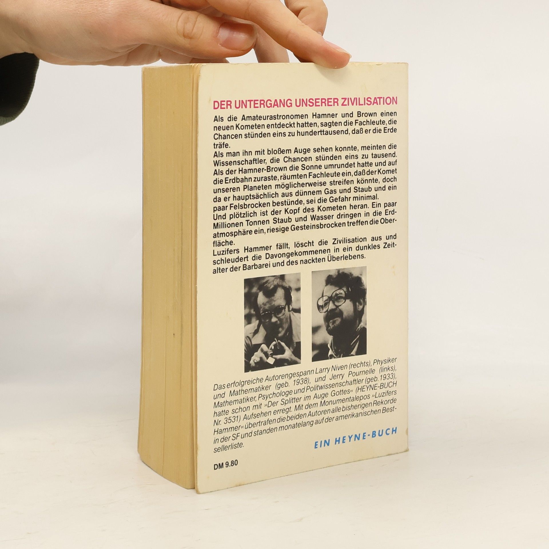 DER UNTERGANG UNSERER ZIVILISATION Als die Amateurastronomen Hammer und Brown einen neuen Komenten entdecken, sagen die Fachleute die Chancen stünden eins zu hunderttausend, daß er die Erde träfe. Als man ihn mit bloßem Auge sehen konnte, meinten die Wissenschaftler, die Chancen stünden eins zu tausend. Als der Hammer-Brown die Sonne umrundet hatte und auf die Erdbahn zuraste, räumten die Fachleute ein, daß der Komet unseren Planeten möglicherweise streifen könnte, doch da er hauptsächlich aus dünnem Gas und Staub und ein paar Felsbrocken bestünde, sei die Gefahr minimal. Und plötzlich ist der Kopf des Kometen heran. Ein paar Millionen Tonnen Staub und Wasser dringen in die Erdatmosphäre ein, riesige Gesteinsbrocken treffen die Oberfläche. Luzifers Hammer fällt, löscht die Zivilisation aus und schleudert die Davongekommenen in ein dunkles Zeitalter der Barbarei und des nackten Überlebens.