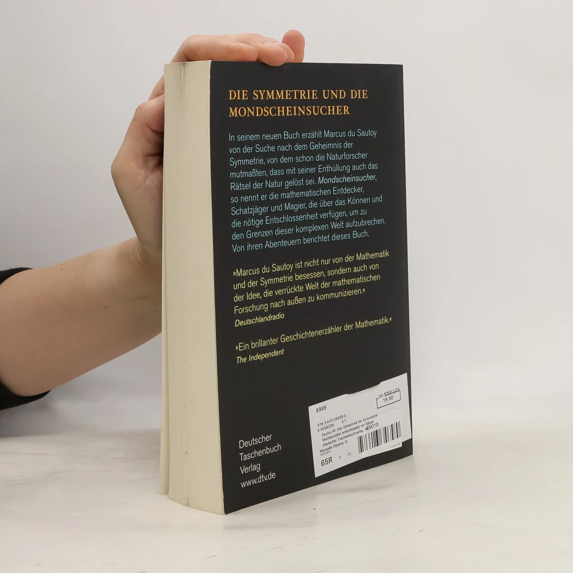 Symmetrie steht für Schönheit Die Suche nach dem Geheimnis der Symmetrie führt Du Sautoy zwölf Monate lang rund um die Welt, durch die Wüste Sinai ebenso wie ans Mathematische Institut der Universität Princeton, in die Gärten der Alhambra oder ins Paris der Französischen Revolution. Der Leser begegnet auf den Reisen des Autors zahlreichen ebenso brillanten wie skurrilen mathematischen Köpfen. Die größte Herausforderung aber ist „monstrous moonshine“, monströser Mondschein, so der Name einer der aufregendsten mathematischen Entdeckungen der letzten Jahrzehnte. Damit könnte der entscheidende Schritt zur Entschlüsselung des Geheimnisses der Symmetrie gemacht sein. Als Hardcover erschienen unter dem Titel: Die Mondscheinsucher. Mathematiker entschlüsseln das Geheimnis der Symmetrie