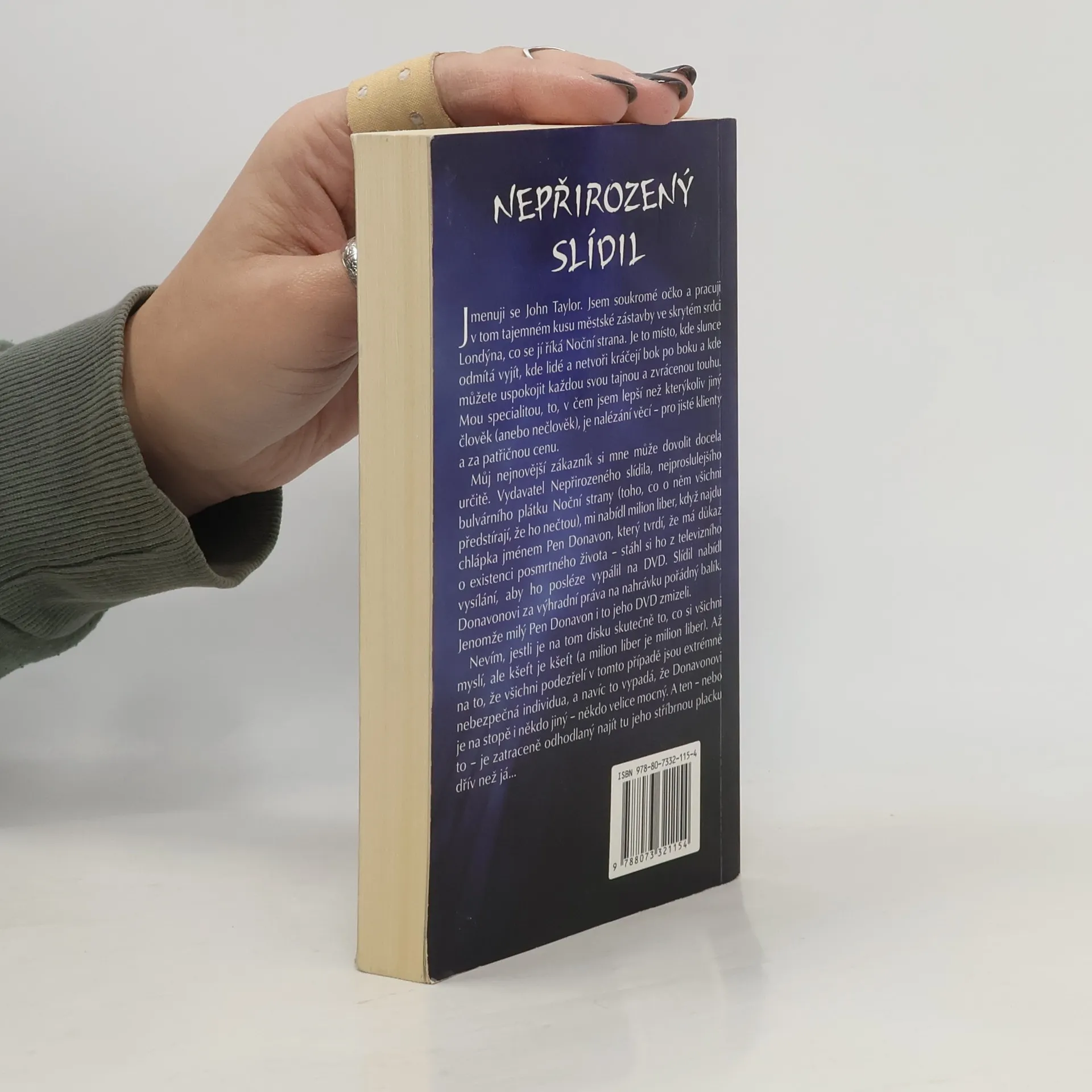 Jmenuji se John Taylor. Jsem soukromé očko a pracuji v tom tajemném kusu městské zástavby ve skrytém srdci Londýna, co se jí říká Noční strana. Je to místo, kde slunce odmítá vyjít, kde lidé a netvoři kráčejí bok po boku a kde můžete uspokojit každou svou tajnou a zvrácenou touhu. Mou specialitou, to, v čem jsem lepší, než kterýkoliv jiný člověk (anebo nečlověk), je nalézání věcí – pro jisté klienty a za patřičnou cenu. Můj nejnovější zákazník si mne může dovolit docela určitě. Slídil nabídl Donavonovi za výhradní práva na nahrávku pořádný balík. Nevím, jestli je na tom disku skutečně to, co si všichni myslí, ale kšeft je kšeft (a milion liber je milion liber). Až na to, že všichni podezřelí v tomto případě jsou extrémně nebezpečná individua a navíc to vypadá, že Donavanovi je na stopě i někdo jiný – někdo velice mocný. A ten – nebo to – je zatraceně odhodlaný najít tu jeho stříbrnou placku dřív, než já…