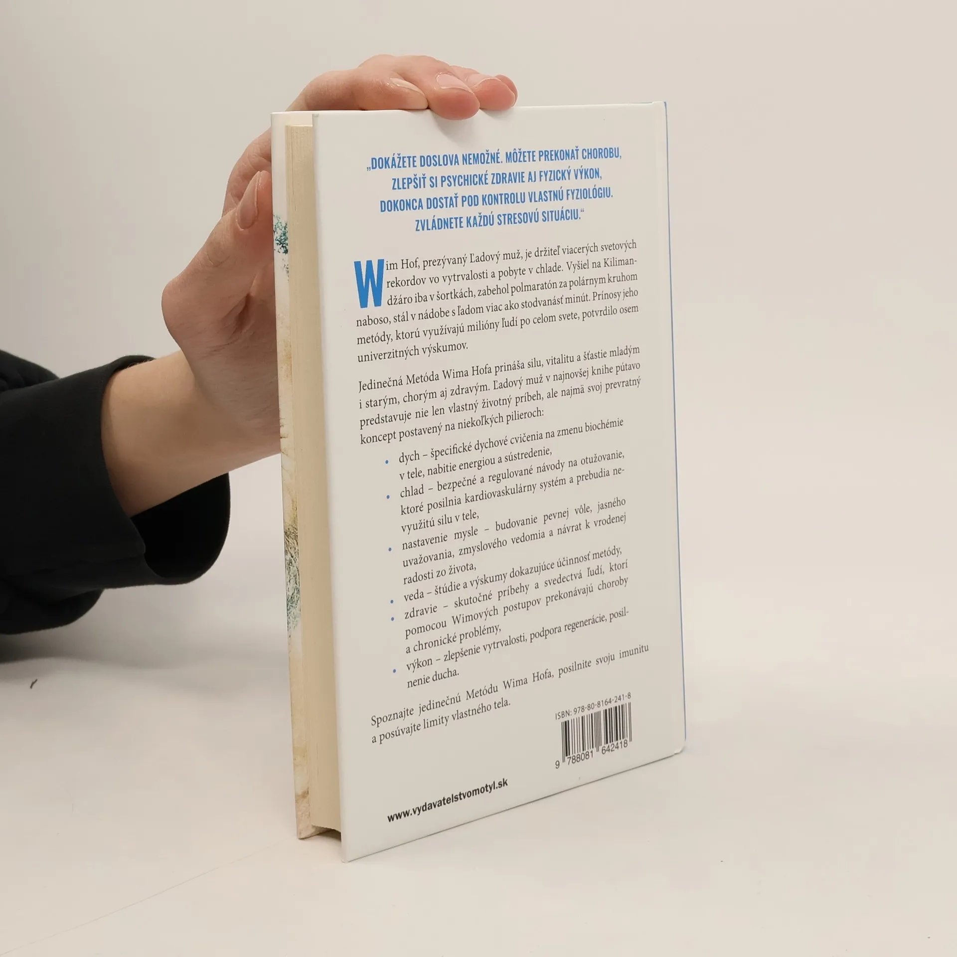 „Dokážete doslova nemožné. Môžete prekonať chorobu, zlepšiť si psychické zdravie aj fyzický výkon, dokonca dostať pod kontrolu vlastnú fyziológiu. Zvládnete každú stresovú situáciu. “ Wim Hof, prezývaný Ľadový muž, je držiteľ viacerých svetových rekordov vo vytrvalosti a pobyte v chlade. Vyšiel na Kilimandžáro iba v šortkách, zabehol polmaratón za polárnym kruhom naboso, stál v nádobe s ľadom viac ako stodvanásť minút. Prínosy jeho metódy, ktorú využívajú milióny ľudí po celom svete, potvrdilo osem univerzitných výskumov.