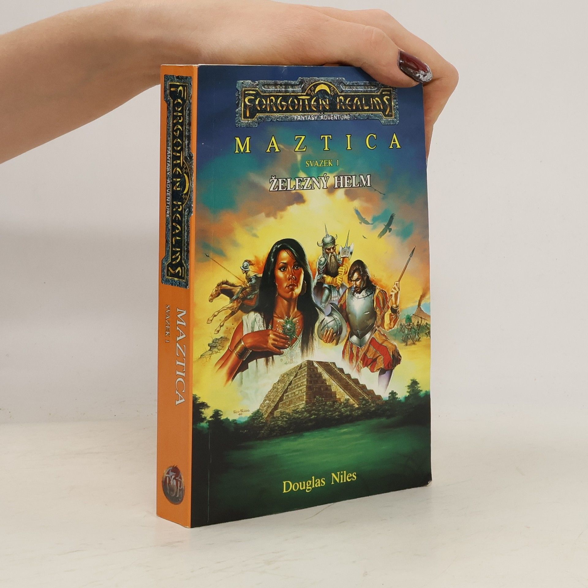 ŽELEZNÝ HELM je prvním dílem Maztické trilogie. Je novou ságou Douglase Nilese, založenou na fantastickém pozadí FORGOTTEN REALMS. V koutech světa, které jsou velmi vzdálené od známých Zapomenutých říší, se nalézá exotický kontinent Mazticy. Tam se mladá otrokyně, Erix, dozví o mocném osudu, jenž na ni bohové vložili. V té době se za mořem připravuje osudná výzkumná výprava. Výzkumníci, legie zkušených žoldnéřů, se plaví na západ, aby objevili národy primitivní krutosti smíšené s vysokou kulturou; s brutálními krvežíznivými bohy a bohatými poklady. Pod praporem jejich bdělého boha, Helma, si legie první z těchto zemí podrobí. Erix vidí svou zemi napadenou cizinci, známý svět se kolem ní hroutí a její děsivý osud se začíná neúprosně naplňovat…