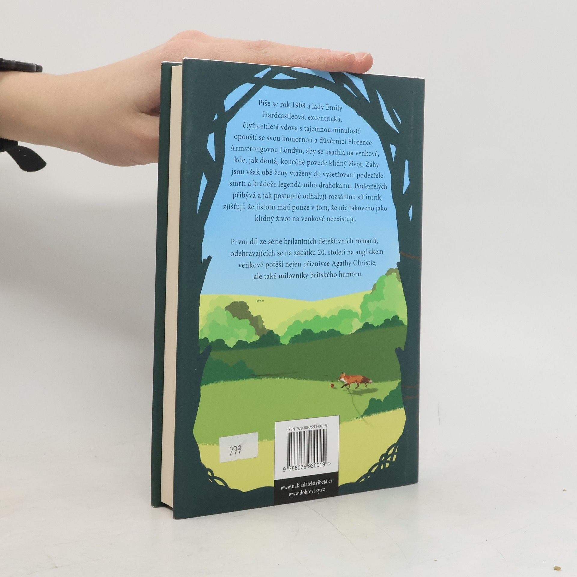 Píše se rok 1908 a lady Emily Hardcastleová, excentrická, čtyřicetiletá vdova s tajemnou minulostí opouští se svou komornou a důvěrnicí Florence Armstrongovou Londýn, aby se usadila na venkově, kde, jak doufá, povede konečně klidný život. Záhy jsou však obě ženy vtaženy do vyšetřování podezřelé smrti a krádeže drahokamu s legendární minulostí a tajemným názvem – Smaragdové oko. První díl ze série brilantních britských detektivních románů, odehrávajících se na začátku 20. století na anglickém venkově potěší nejen příznivce Agathy Christie, ale také milovníky britského humoru.