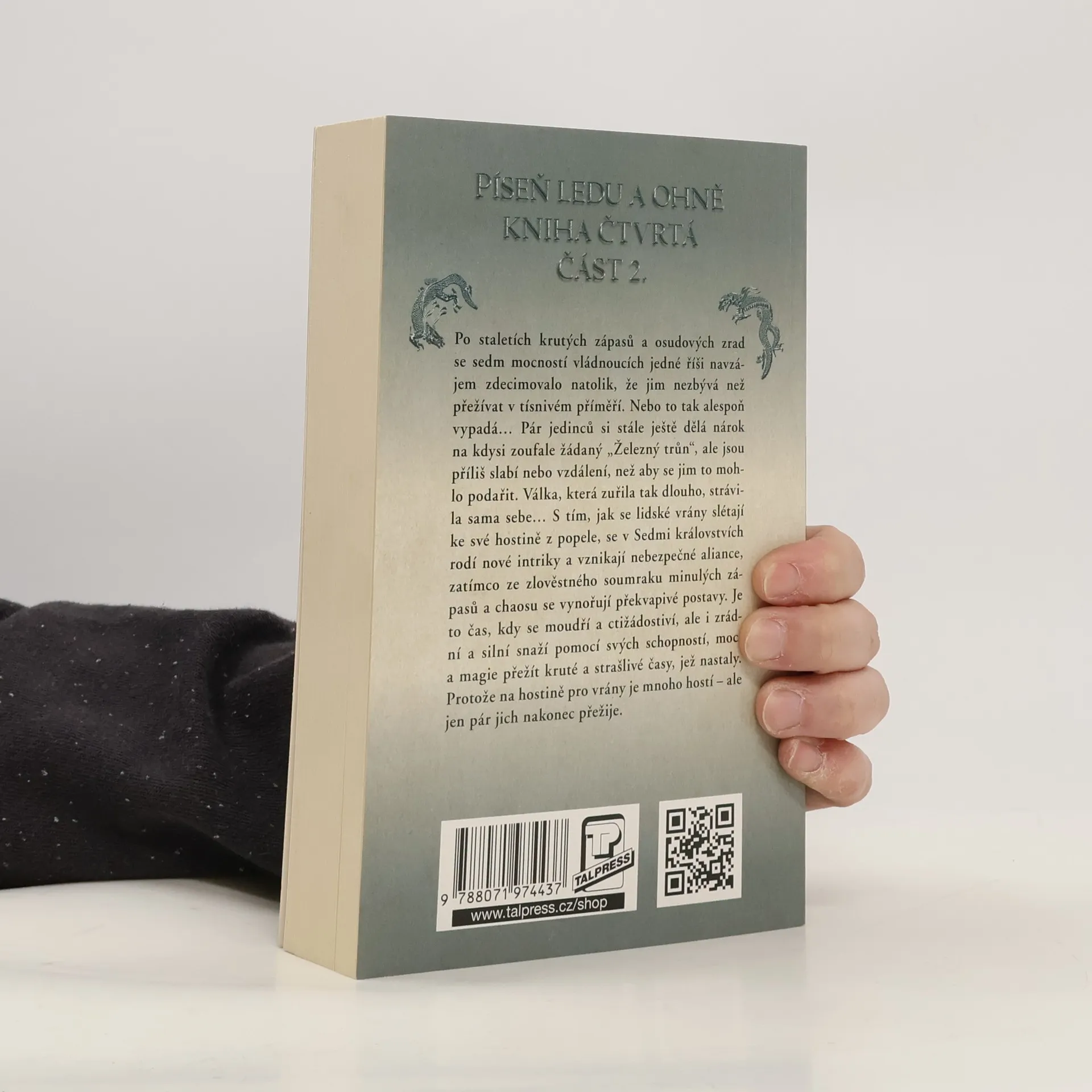 4. kniha série Píseň ledu a ohně, část 2. Nové a opravené vydání. Po staletích krutých zápasů a osudových zrad se sedm mocností vládnoucích jedné říši navzájem zdecimovalo natolik, že jim nezbývá než nyní žít v tísnivém příměří. Nebo to tak alespoň vypadá. Pár jedinců si stále ještě dělá nárok na kdysi zoufale žádaný Železný trůn, ale jsou příliš slabí nebo vzdálení, než aby se jim to mohlo podařit. Válka, která zuřila tak dlouho, strávila sama sebe… Avšak jako v dohře jakéhokoli vrcholného zápasu netrvá dlouho, a začnou shromažďovat zrádci, psanci, odpadlíci a mrchožrouti, hašteřící se nad kostmi mrtvých a nad kořistí přeživších. S tím, jak se lidské vrány slétají ke své hostině z popele, se v Sedmi královstvích rodí nové intriky a vznikají nebezpečné aliance, zatímco ze zlověstného soumraku minulých zápasů a chaosu se vynořují překvapivé postavy. Je to čas, kdy se moudří a ctižádostiví, ale i zrádní a silní snaží pomocí svých schopností, moci a magie přežít kruté a strašlivé časy, jež nastaly. Je to čas, kdy se lidé prostí i urození, bojovníci i čarodějové, úkladní vrazi i mudrcové dávají dohromady a snaží se bojovat o své místo na zemi a své životy. Protože na hostině pro vrány je mnoho hostí ale jen pár jich nakonec přežije.