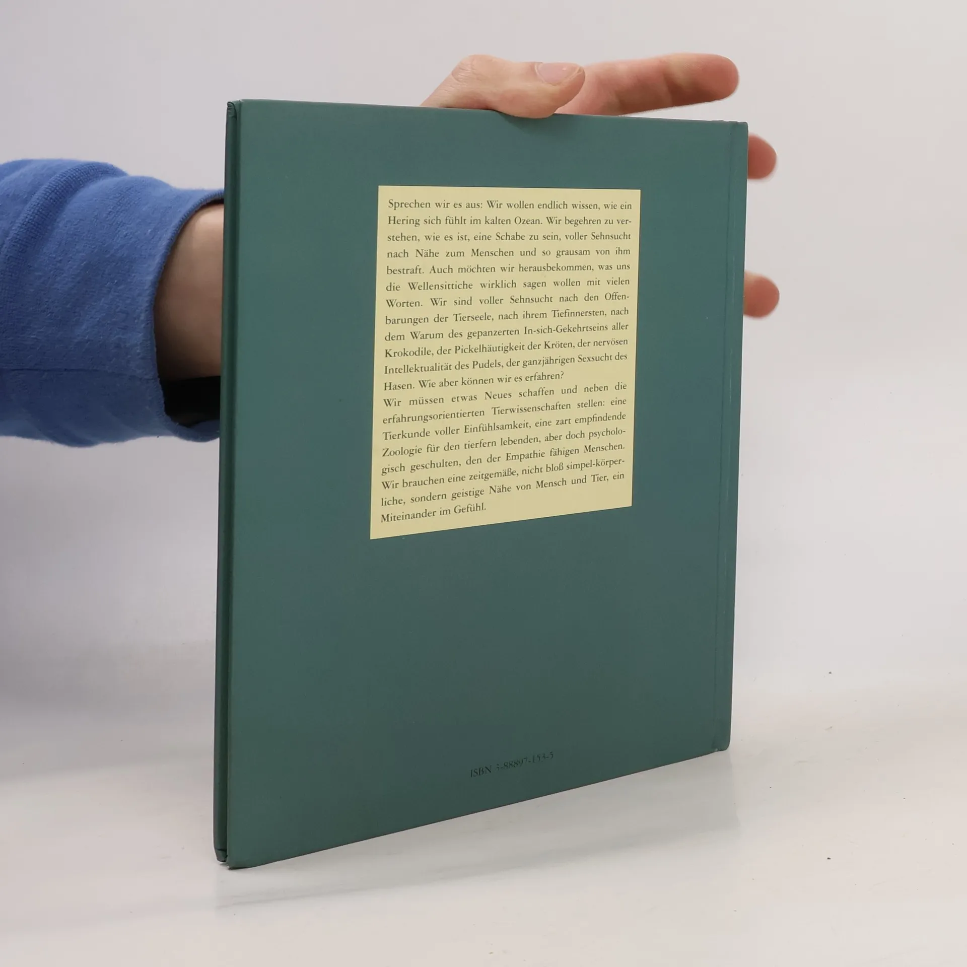 Sprechen wir es aus: Wir wollen endlich wissen, wie der Hase zum Angsthasen wurde. Wir begehren zu verstehen, wie es ist, eine Schabe zu sein, voller Sehnsucht nach Nähe zum Menschen und so grausam von ihm bestraft. Auch möchten wir herausbekommen, was uns die Wellensittiche wirklich sagen wollen mit ihren vielen Worten. Kurz: Wir sind voller Sehnsucht nach den Offenbarungen der Tierseele. Wie aber können wir es erfahren? Wir müssen etwas Neues schaffen und neben die erfahrungsorientierten Tierwissenschaften stellen: eine Tierkunde voll Einfühlsamkeit, eine zart empfindende Zoologie für den tierfern lebenden, aber der Empathie fähigen Menschen.