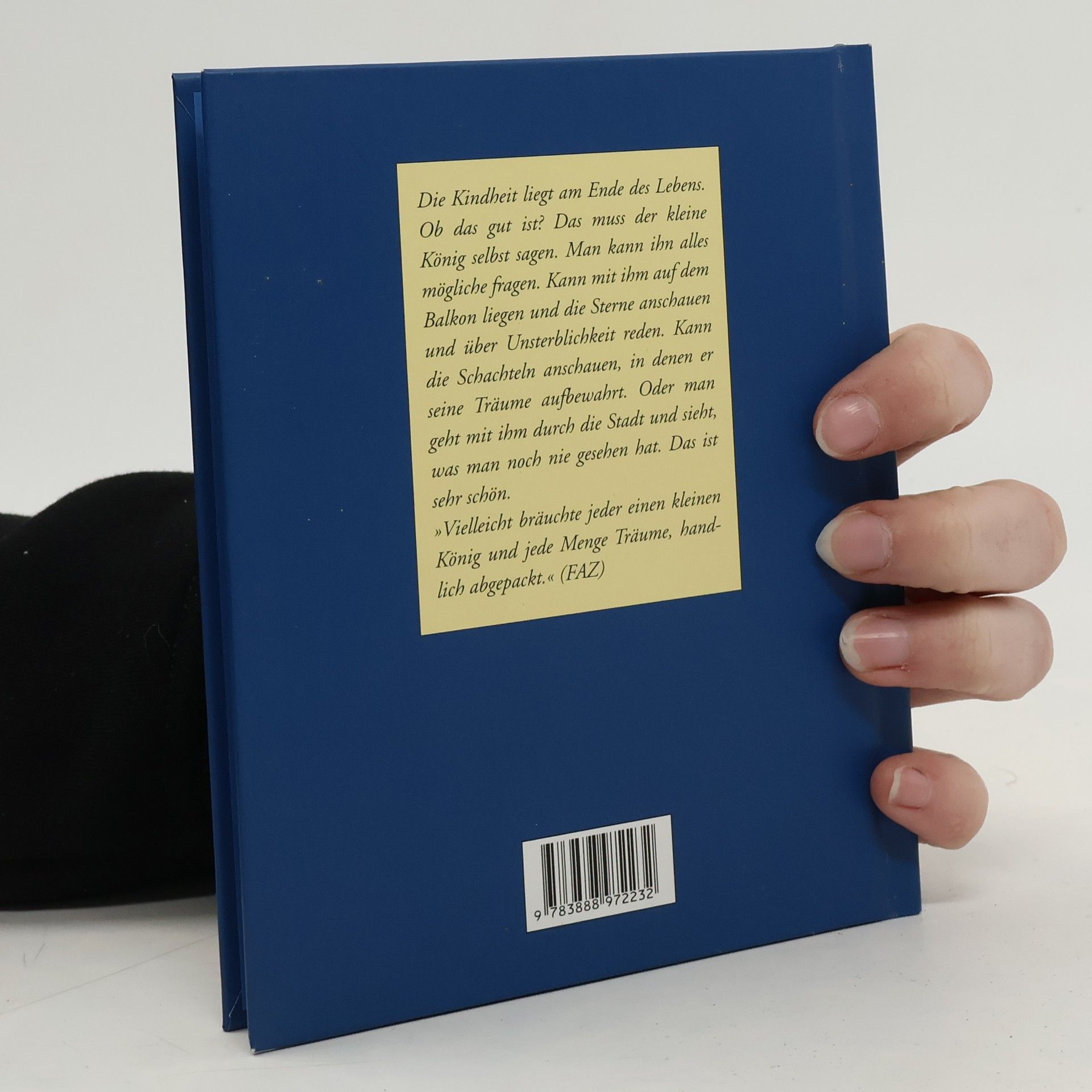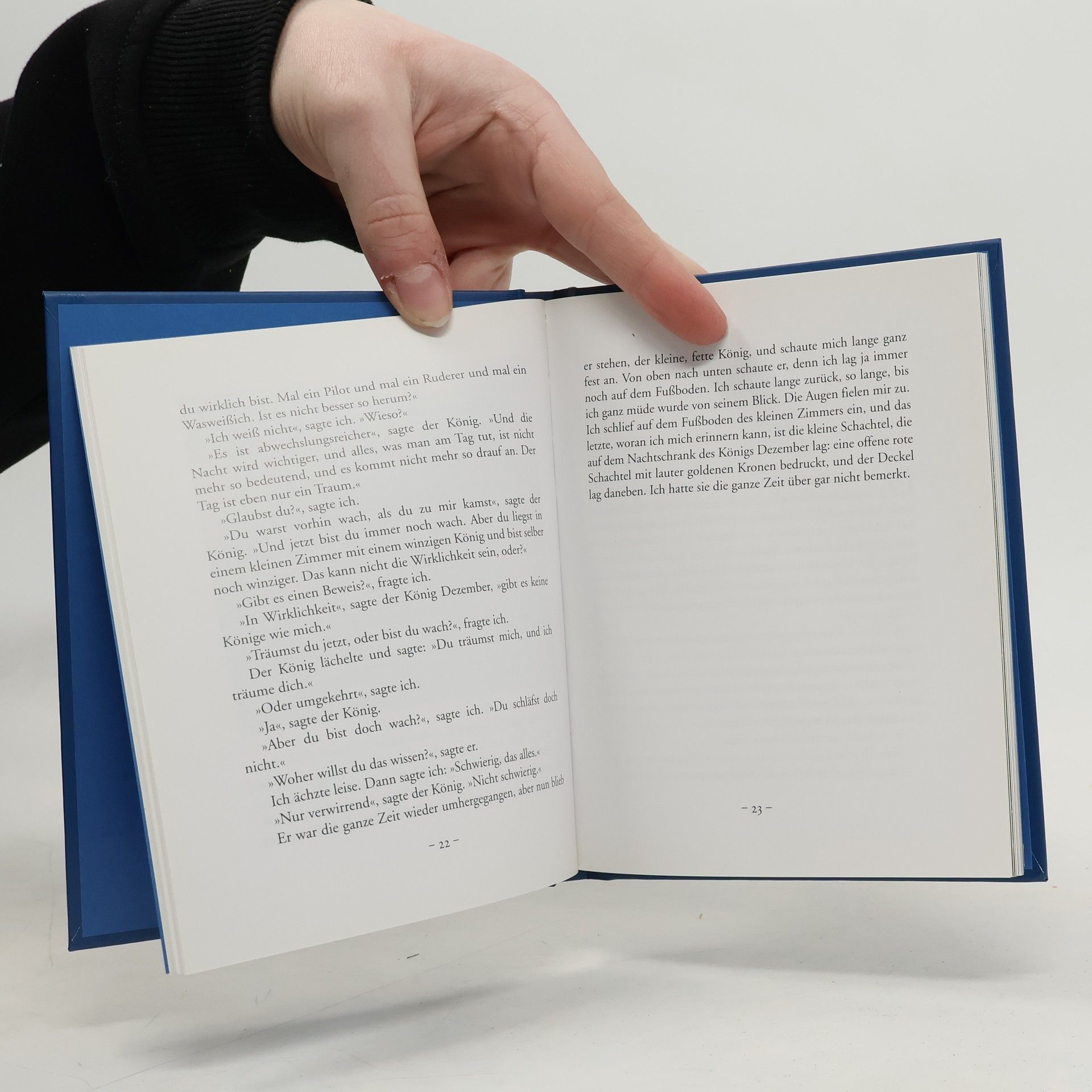 Er ist angezogen wie ein richtiger König, wie ein großer König. Er trägt einen roten Samtmantel mit weißem Hermelinbesatz. Aber er ist ein Winzling, nicht länger als ein Zeigefinger. Und dick ist er, denn seine Lieblingsspeise sind Gummibärchen. Wenn er eins isst, muss er es mit beiden Armen umfassen. Er kann es kaum hochheben, denn es ist beinahe halb so groß wie der ganze König. Und auch sonst ist sein Leben anders als das unsere. Bei seiner Geburt war er schon ausgewachsen und wusste fast alles, konnte rechnen und schreiben. Nur eine Kindheit kannte er nicht, die kommt vielleicht am Ende seines Lebens.