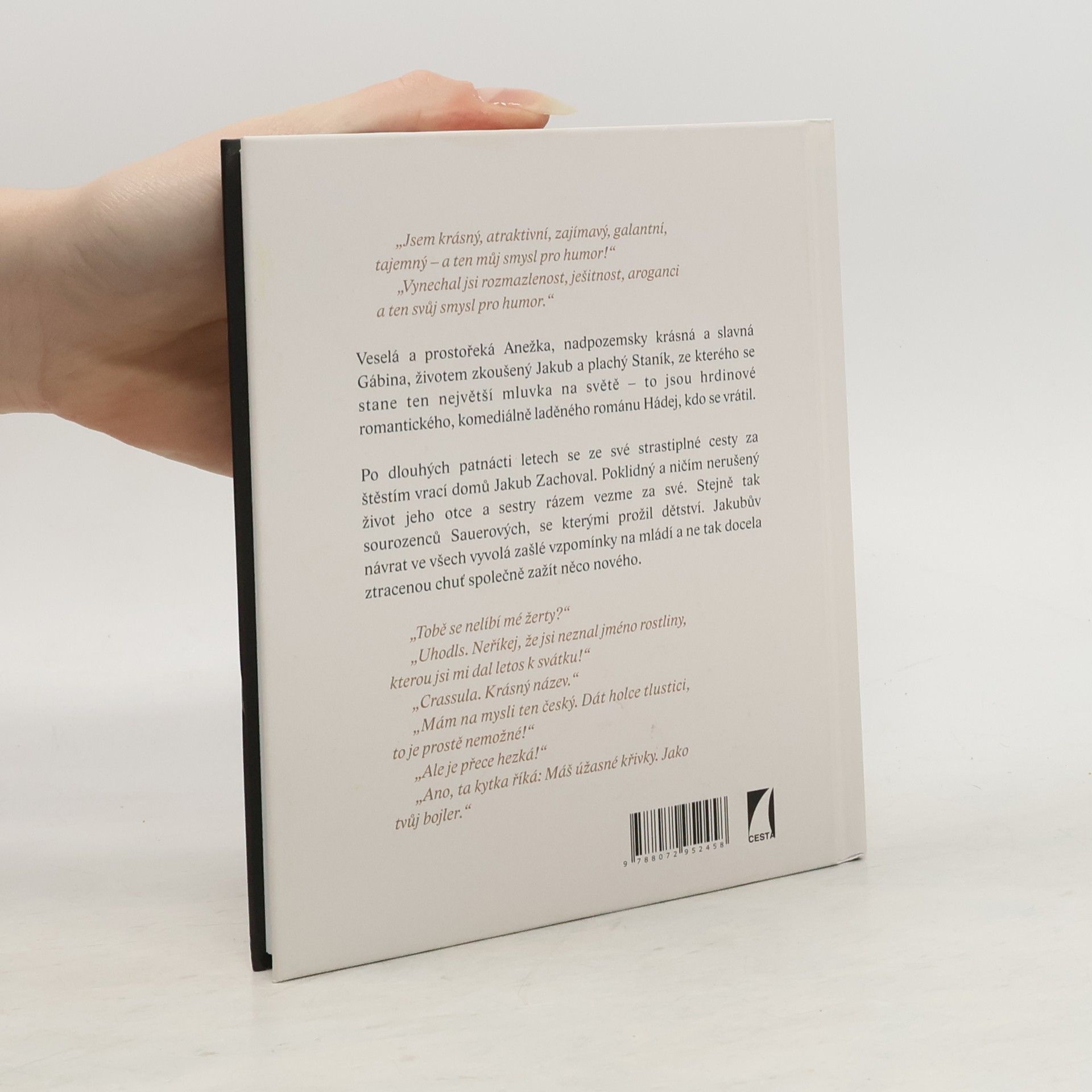 Veselá a prostořeká Anežka, nadpozemsky krásná a slavná Gábina, životem zkoušený Jakub a plachý Staník, ze kterého se stane ten největší mluvka na světě – to jsou hrdinové romantického, komediálně laděného románu Hádej, kdo se vrátil.